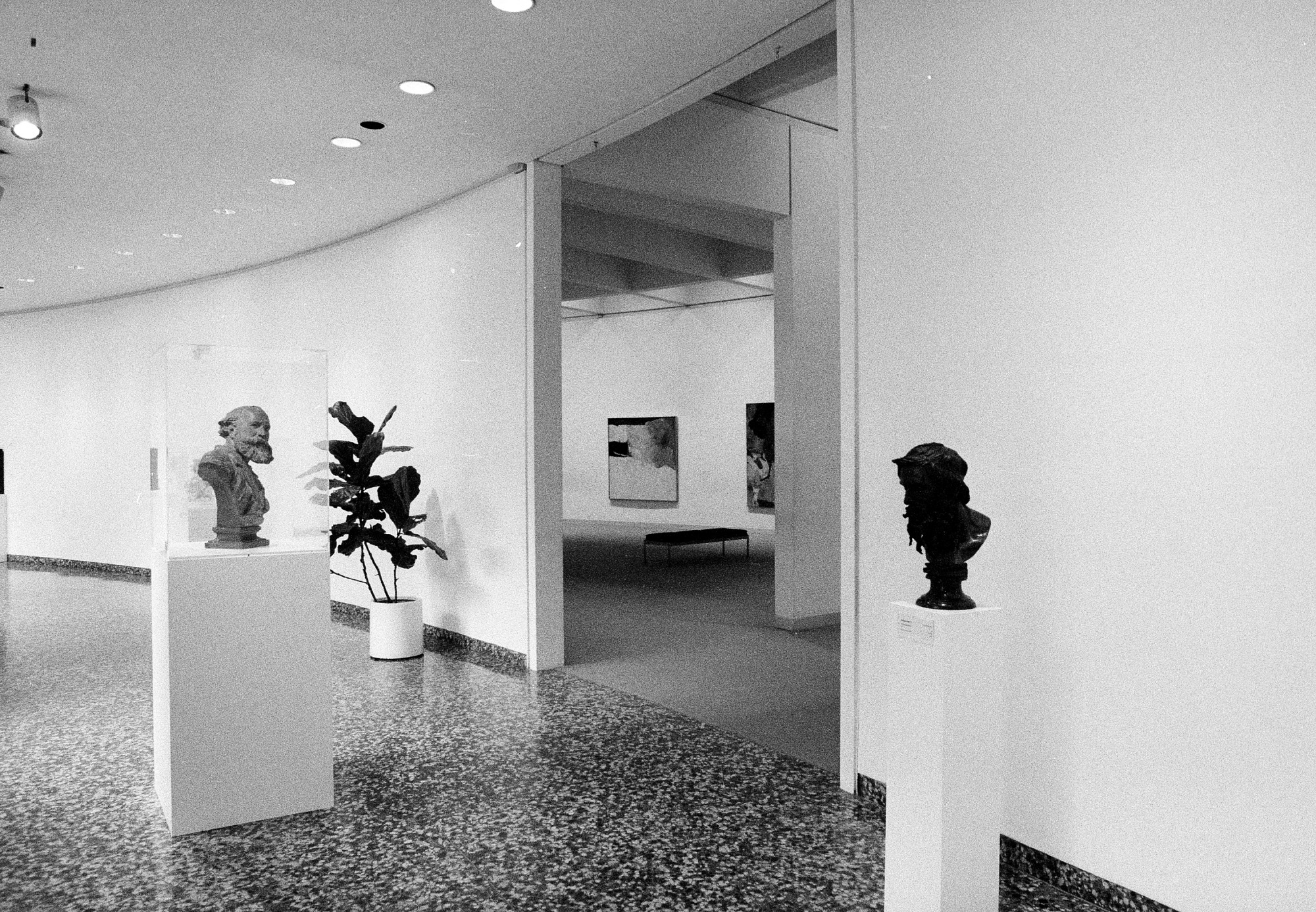 Interior view of the Hirshhorn Museum and Sculpture Garden. There are two busts in the foreground and paintings can be seen in another gallery in the background.