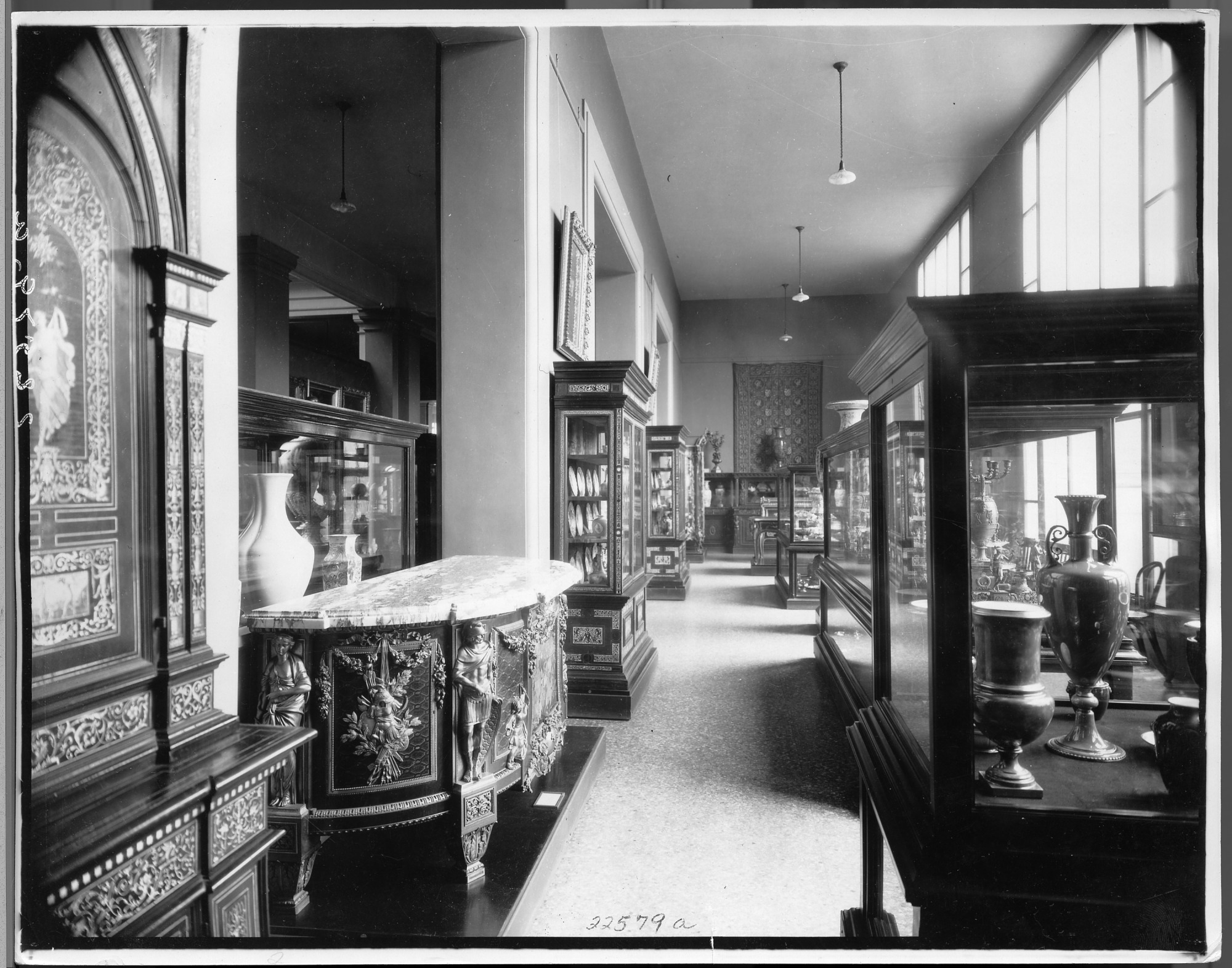 Exhibition of the Pell Collection of china, glassware, and rare art objects. On display is an elaborately decorated marble topped breakfront, a display case of vases, plates and other ceramics lining a principal corridor paralleling main windows in the National Collection of Fine Arts gallery in the Natural History Building.