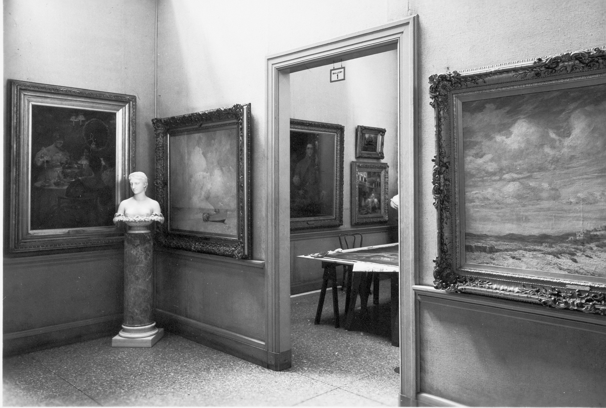 Paintings and a bust on a pedestal exhibited in southwest corner looking into Gallery 1of the National Collection of Fine Arts, now the National Museum of American Art, in the Natural History Building, March 11, 1952. A corner of a canvas on a table can be seen in Gallery 1.
