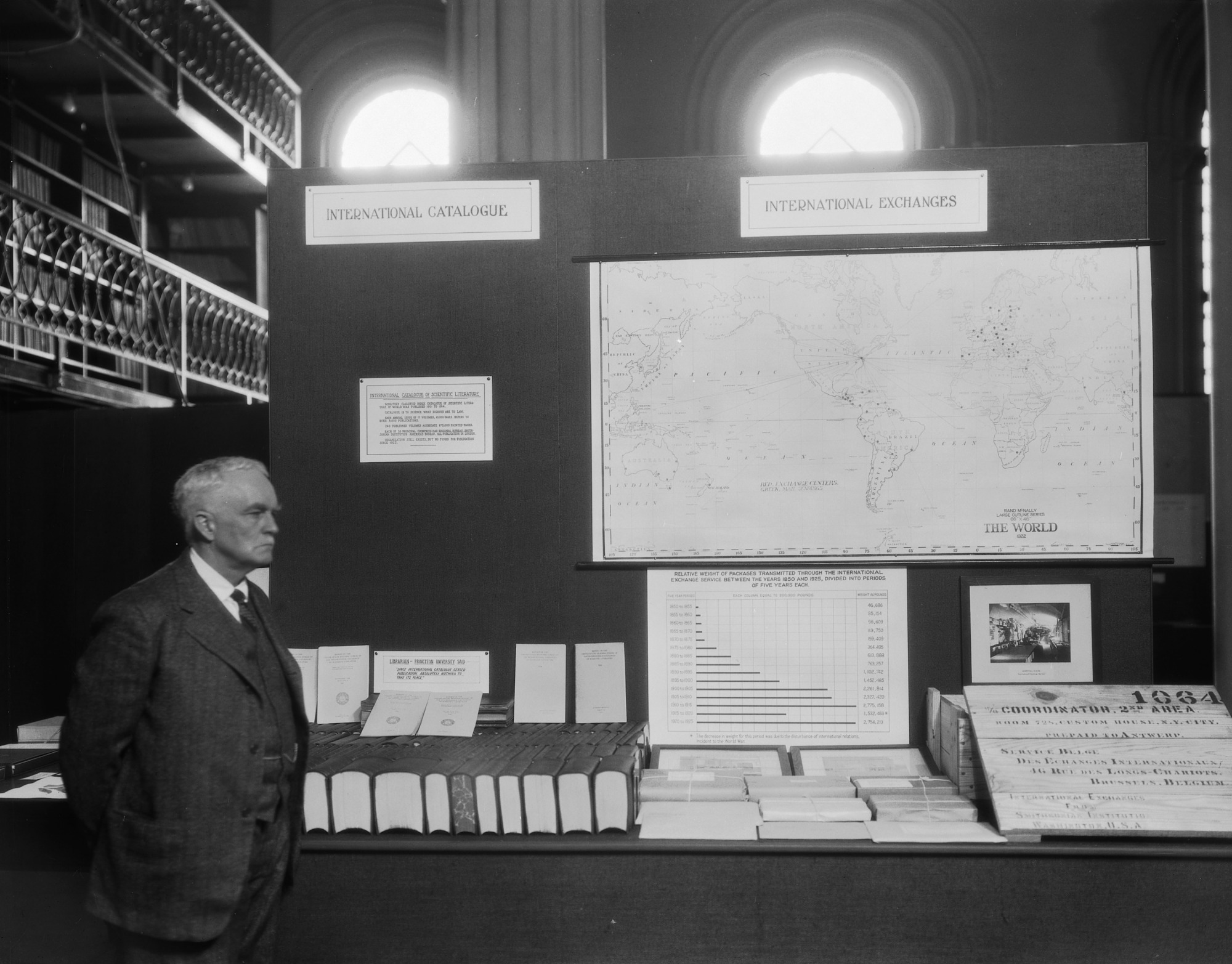 International Catalogue and International Exchanges Exhibit at the Conference on the Future of the Smithsonian, February 11, 1927, with L. C. Gunnell, in charge of International Catalogue standing to the left.