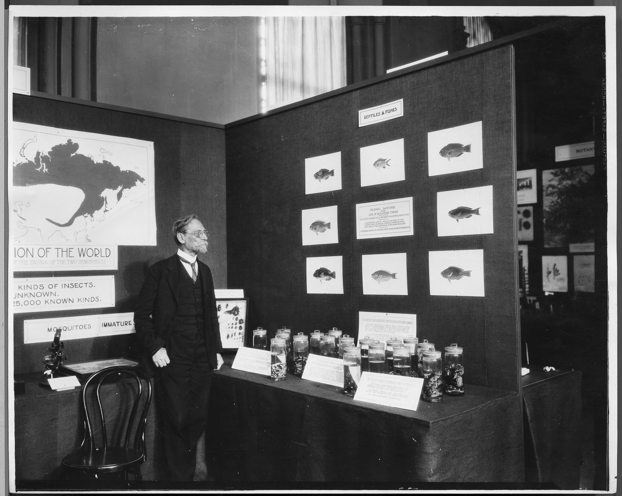 Fishes and Reptiles Exhibit at the Conference on the Future of the Smithsonian, February 11, 1927, with Leonhard Stejneger, Curator of the Division of Reptiles, standing to the left.