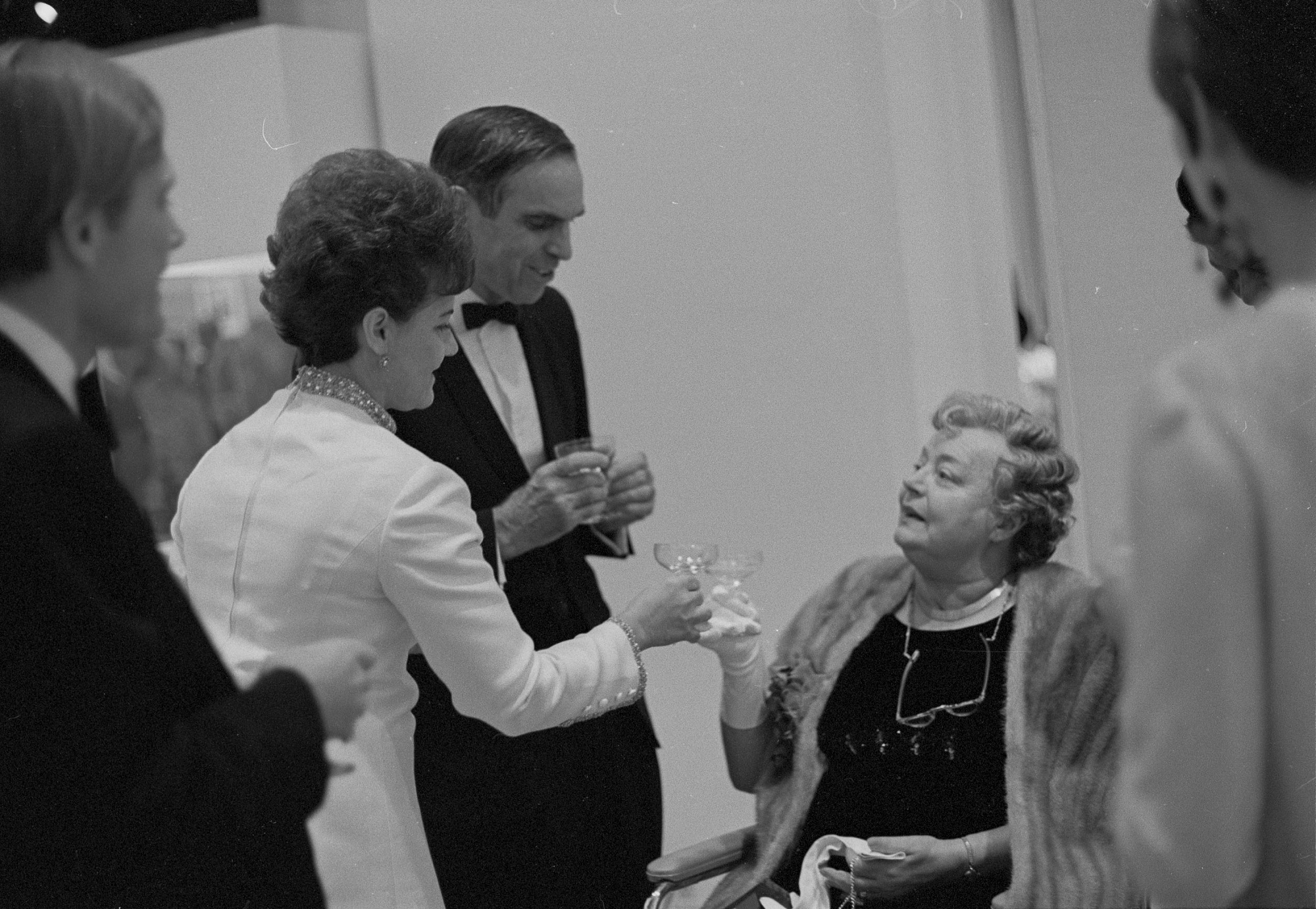 Dr. David Scott, Director of the National Collection of Fine Arts (NCFA), now the Smithsonian American Art Museum (SAAM), center and Mrs. Scott talk with Mrs. Charles Sheeler, seated, at the opening of a memorial exhibition of the works of Charles Sheeler at the NCFA on October 9, 1969. In this photograph Mrs. Scott and Mrs. Sheeler are toasting champagne glasses.
