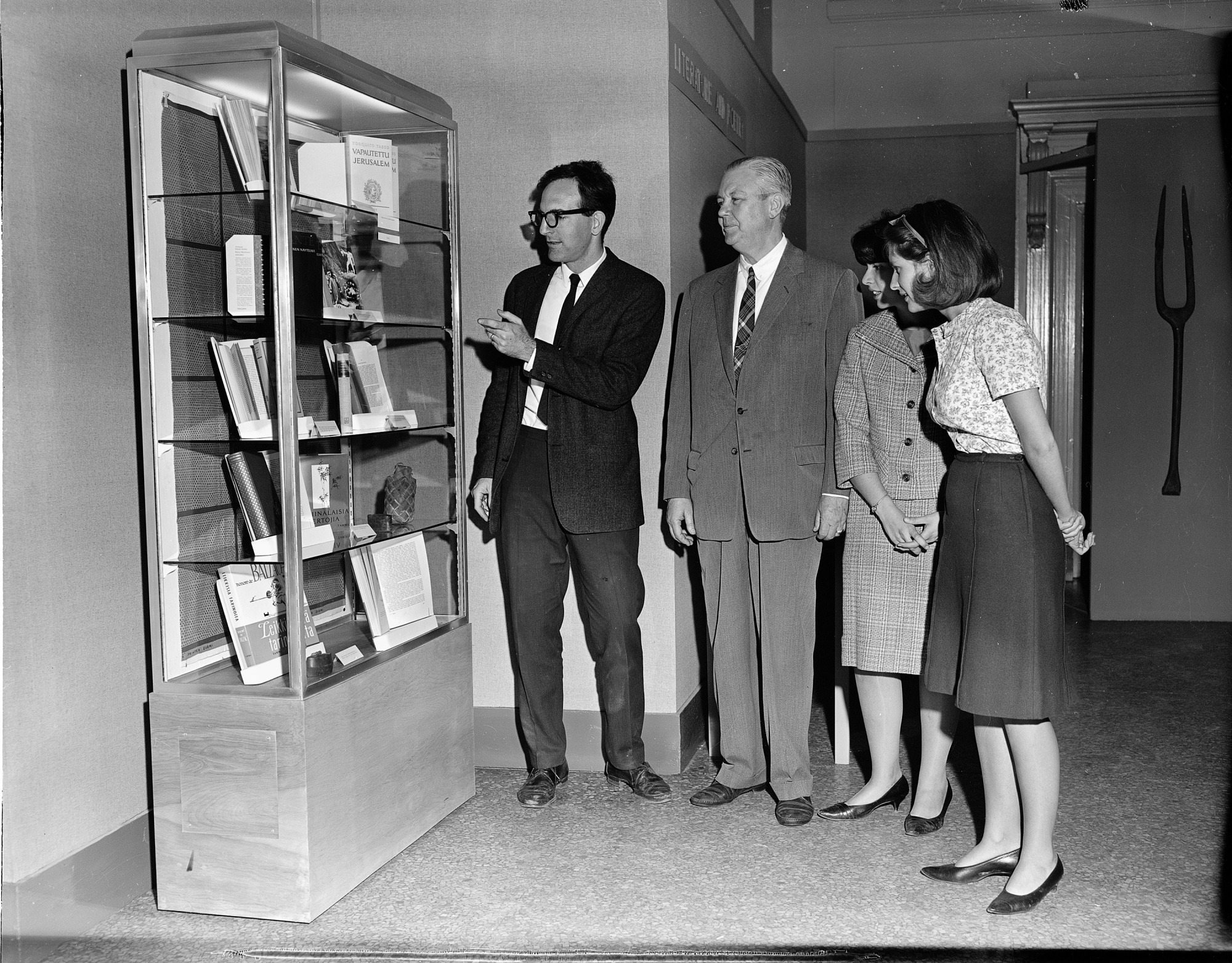 Opening of "100 Books from Finland" exhibit at the National Collection of Fine Arts (NCFA), now the National Museum of American Art, in the Foyer Gallery of the Natural History Building, November 19,1964. The exhibit was sponsored by the Ambassador of Finland. L to R: Val E. Lawton, NCFA; Rowland Lyon, Curator of Art, NCFA; Marjorie Zapruder, NCFA; Priscella Porter, NCFA.
