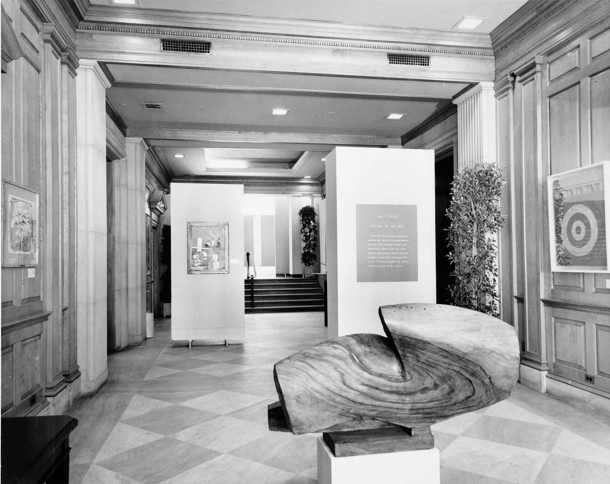 "White House Festival of the Arts" exhibition, June 14, 1965. The exhibit was sponsored in The White House by Mrs. Lyndon B. Johnson featuring contemporary American paintings and sculpture. The exhibit was designed and installed by Harry Lowe, curator of exhibits, National Collection of Fine Arts, now the National Museum of American Art. Photo shows sign and several works of art installed including a large wooden sculpture in foreground.