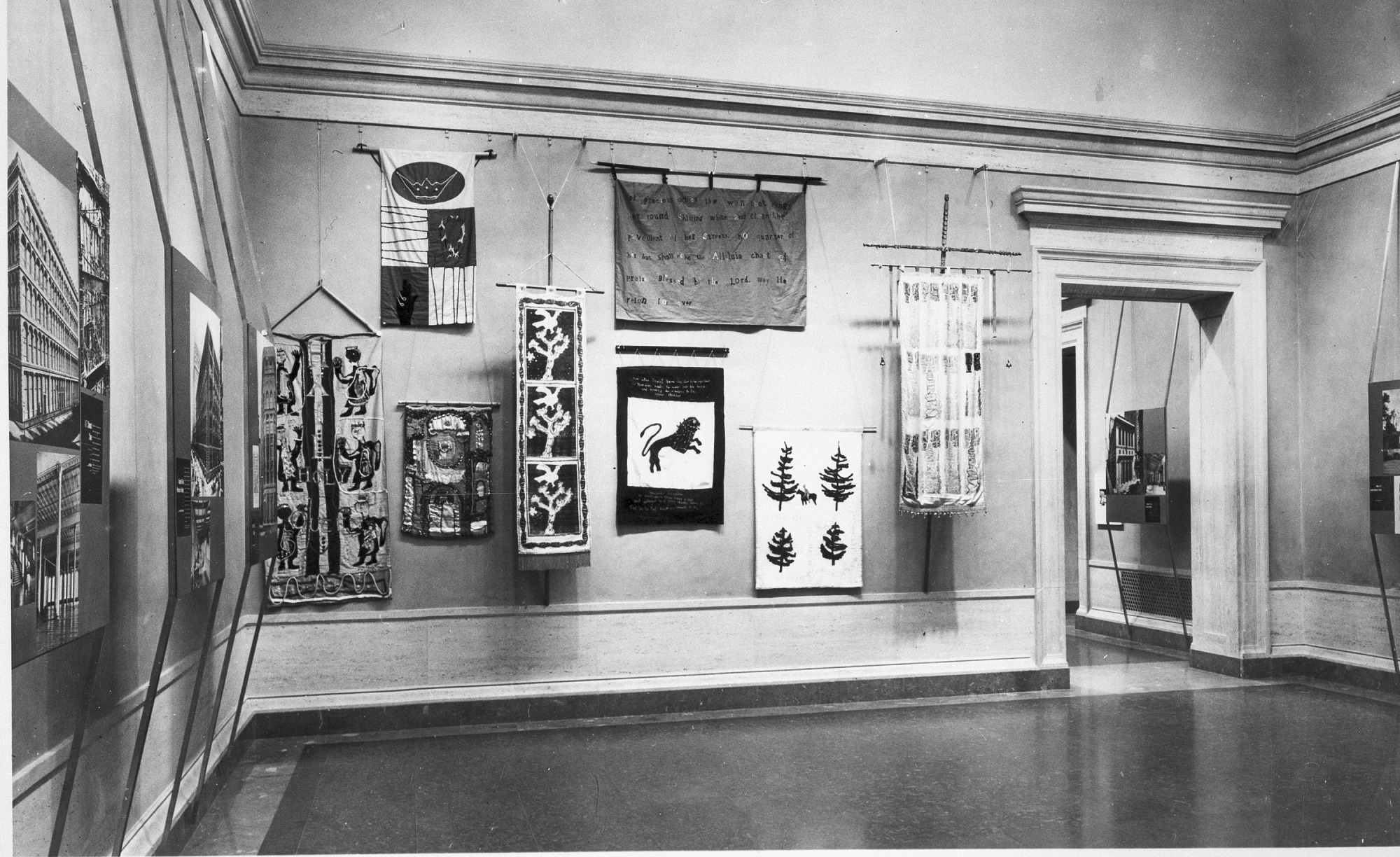 "Religious Banners," created by students of Immaculate Heart College, Los Angeles, to add a colorful note to the Centennial Exhibition of the American Institute of Architects held at the National Collection of Fine Arts, now the National Museum of American Art, in the Natural History Building in the summer of 1957. The banners revive a tradition which flourished in the religious processions of medieval Europe. They were subsequently circulated by the Smithsonian Institution Traveling Exhibition Service (SITES).
