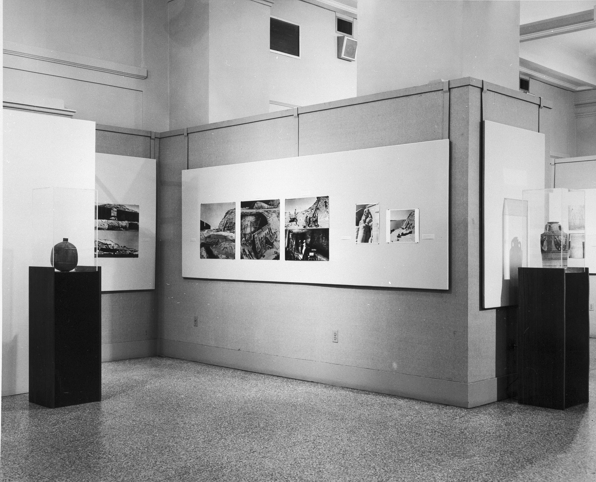 "The Preservation of Abu Simbel," exhibition at the National Collection of Fine Arts, now the National Museum of American Art, in the Foyer Gallery of the Natural History Building, September 11 - October 10, 1965. The exhibition contains photographs and artifacts from when the temple was moved to higher ground to save if from destruction when the Aswan High Dam was constructed. Close up of one corner of exhibit.