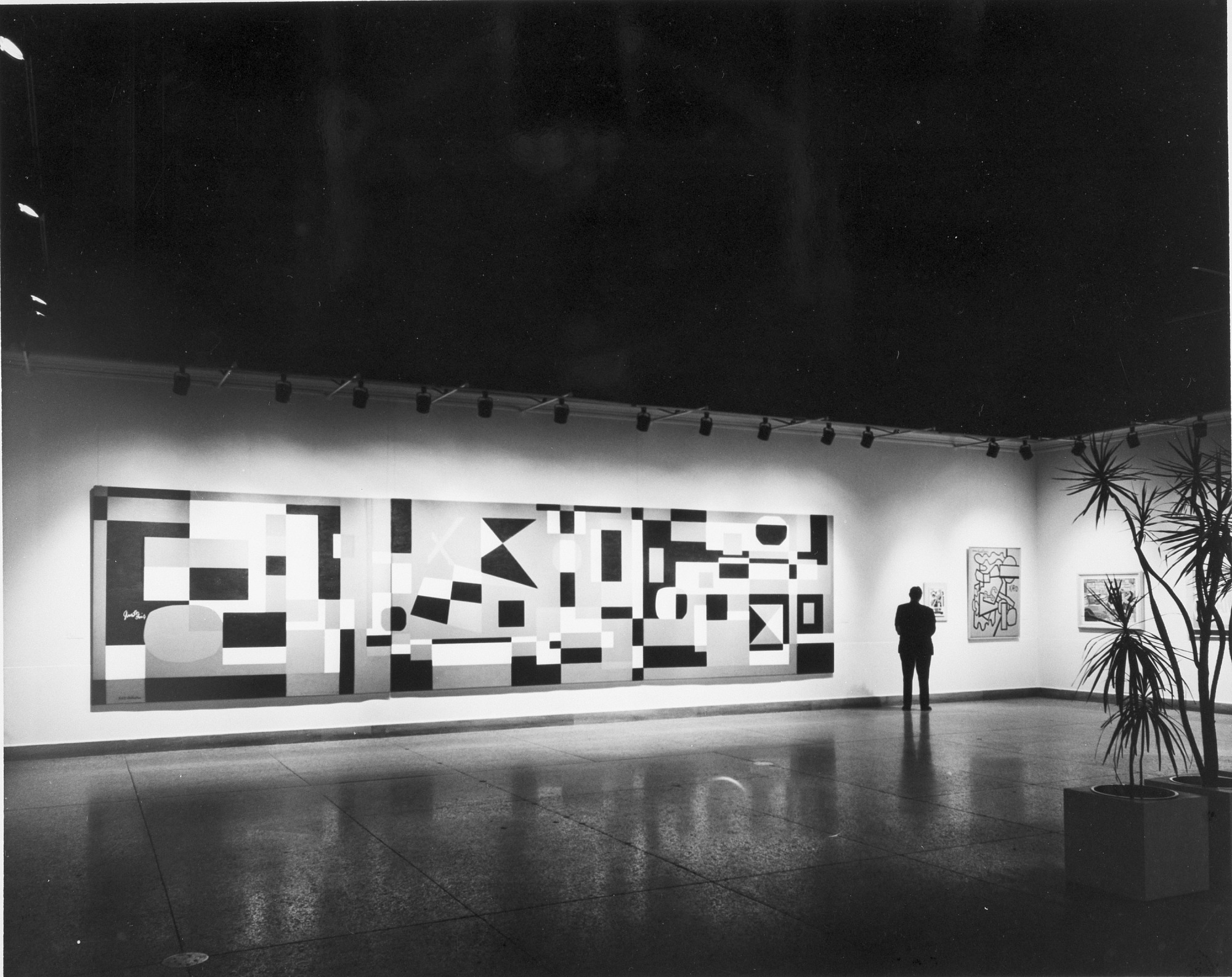 "Stuart Davis" (1894-1954) exhibition at the National Collection of Fine Art, now the National Museum of American Art, in the Natural History Building, May 28-July 5, 1965. A visitor is viewing a large Stuart Davis work. Subsequently exhibited at the Art Institute, Chicago; The Whitney Museum, New York; and the Art Gallery, UCLA.