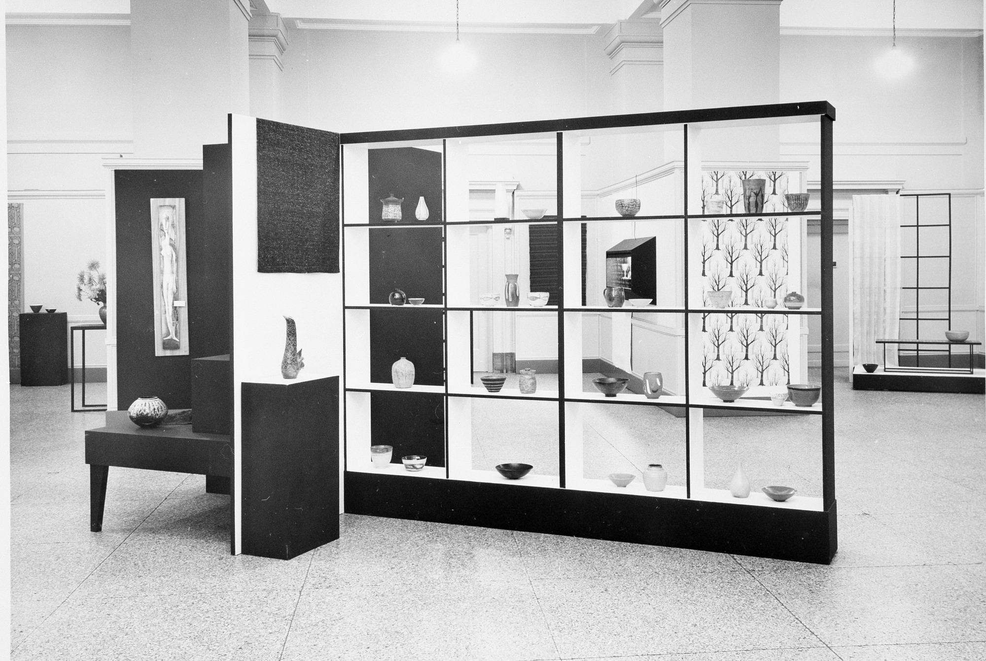 Second Biennial Exhibition of Creative Crafts in the National Collection of Fine Arts, now the National Museum of American Art, Foyer Gallery in the Natural History Building, August 23-September 21,1956. Sponsored by the Ceramic Guild of Bethesda, Cherry Tree Designers, Clay Pigeons of Kensington, Design-Weavers and Kiln Club of Washington. General view of exhibit.
