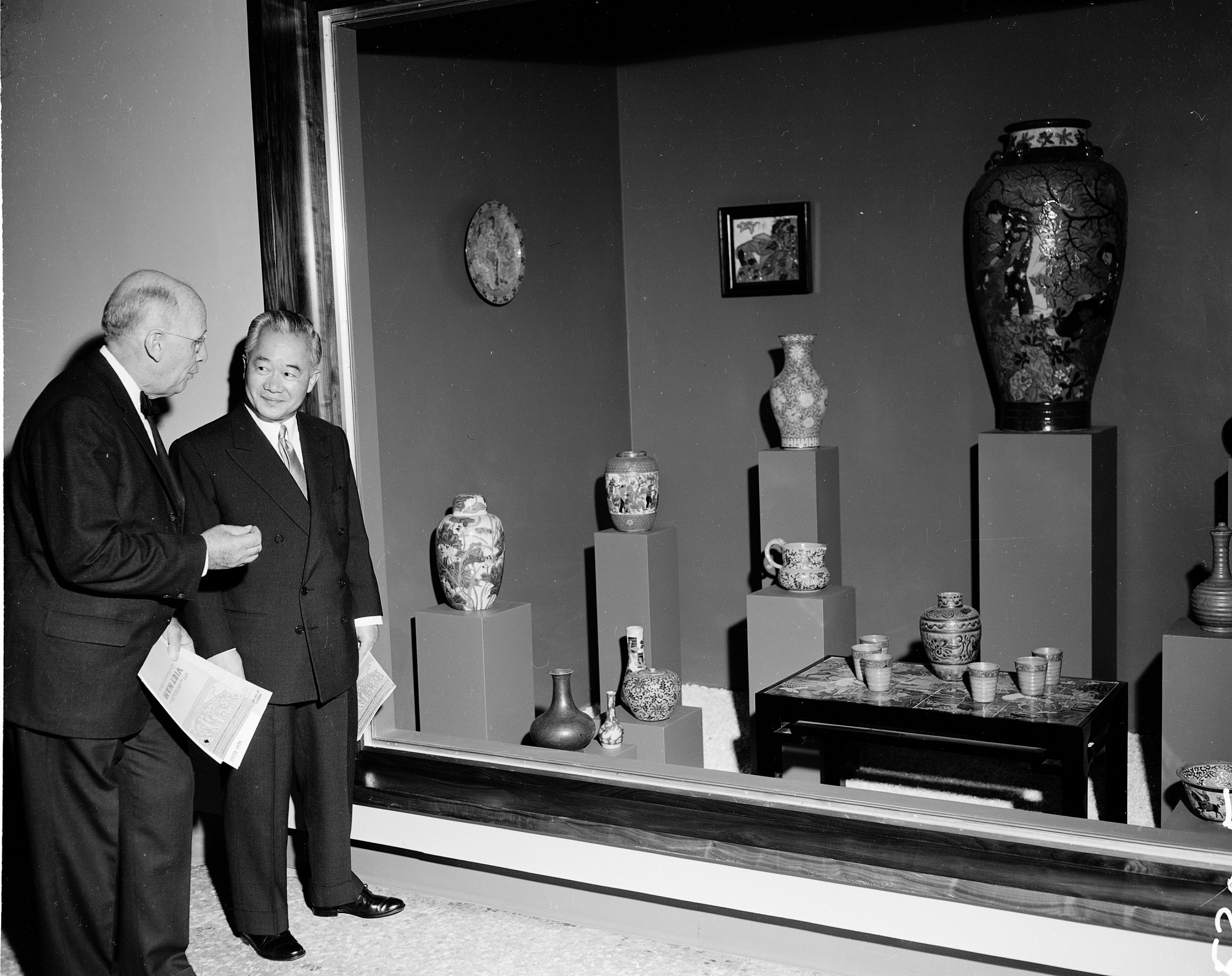 The National Collection of Fine Arts, now the National Museum of American Art, exhibition "Art and Archeology of Viet-Nam" at the Natural History Building, October 27-December 8,1960. The exhibit includes more than 400 objects covering several centuries. It subsequently toured United States cities under the aegis of the Smithsonian Institution Traveling Exhibition Service. In this photograph taken on October 26,1960 at the opening reception for invited dignitaries, NCFA Director Thomas M. Beggs discusses exhibits with Vietnamese guest.