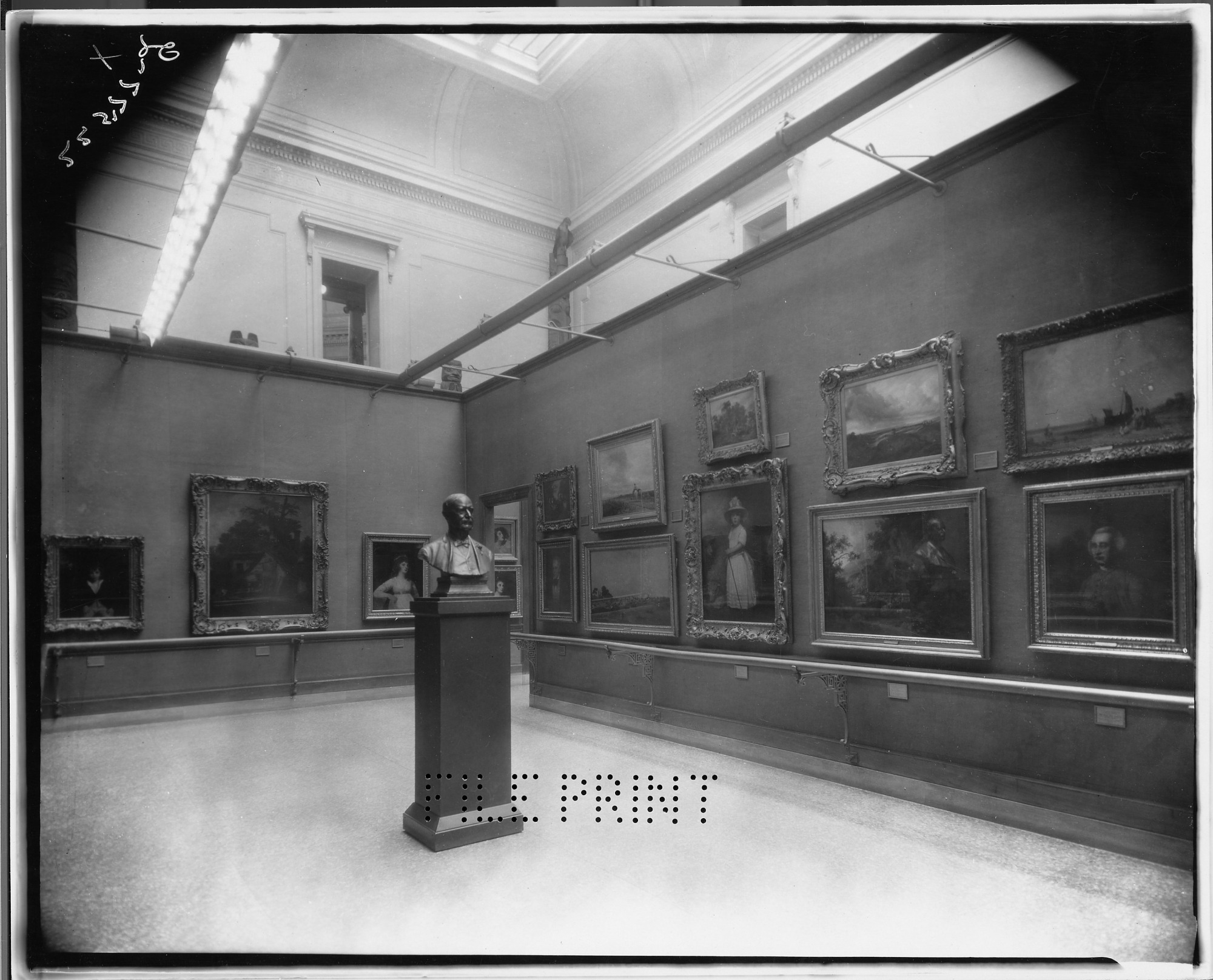 The John Howard McFadden Collection of British Old Masters on display in the National Collection of Fine Arts galleries (now the Smithsonian American Art Museum) at the United States National Museum (now the National Museum of Natural History), in the East Room. Photo shows twelve paintings hung on the exhibit walls. A bust sculpture sits on pedestal in the center of the room center foreground. Paintings in next gallery are visible through doorway at far end of long wall. Above the exhibit walls is a partial view of the second floor structure of the USNM building. John Howard McFadden donated the collection of British Old Masters, 43 portraits and landscapes of the British School, to the Philadelphia Museum of Fine Arts, and the collection was displayed at the NCFA from 1923 to 1928, while that museum was being built.
