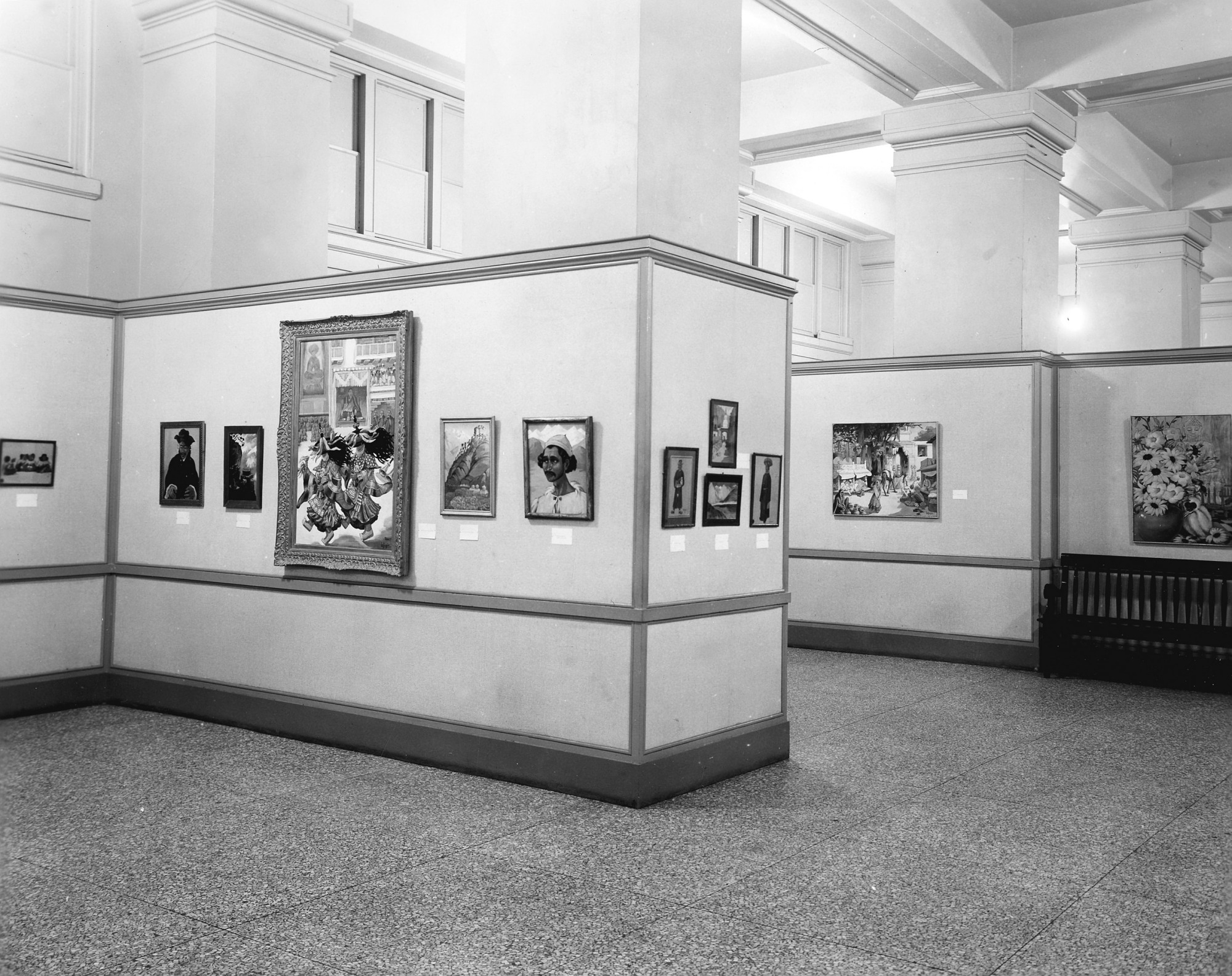 Oils and watercolors from three expeditions to Tibet by the French painter Lafugie at the NCFA in the MNH, June 7-29, 1948. The exhibit, under patronage of His Excellency Henri Bonnet, Ambassador to the US, included 76 oils and 85 framed and unframed watercolors. This general view shows works hanging in four alcoves, background, and watercolors in two large glass topped floor cases, foreground.