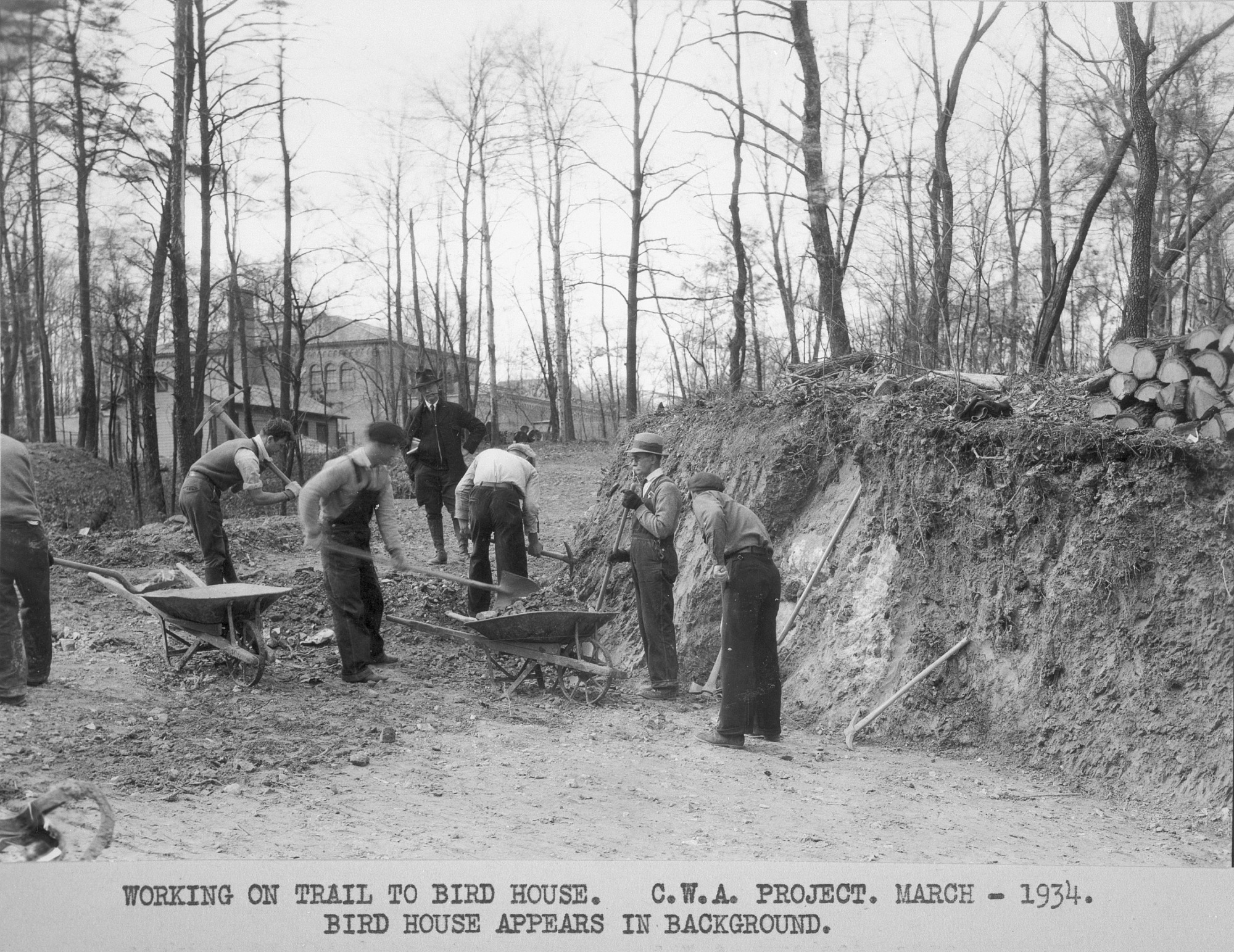 Civil Works Administration Project workers construct a trail to the Bird House in the National Zoological Park in March 1934. The Bird House appears in background. Depression era programs allowed the Zoo to build and renovate many facilities.