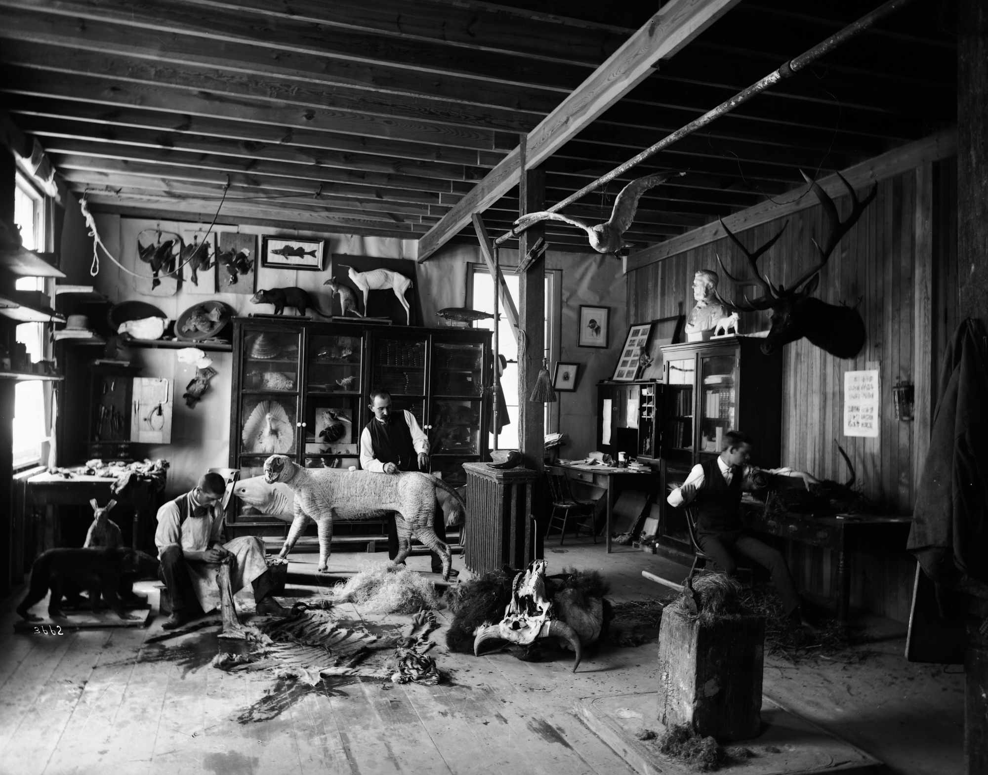 William Temple Hornaday (center), Taxidermist and Zoo Keeper, Andrew Forney, and another unidentified man, working in the taxidermists' laboratory located in a shed in the South Yard behind the Smithsonian Institution Building. A bird hangs from the ceiling, and mounted animals line the shelves. Skulls and animal skins are scattered throughout the room.