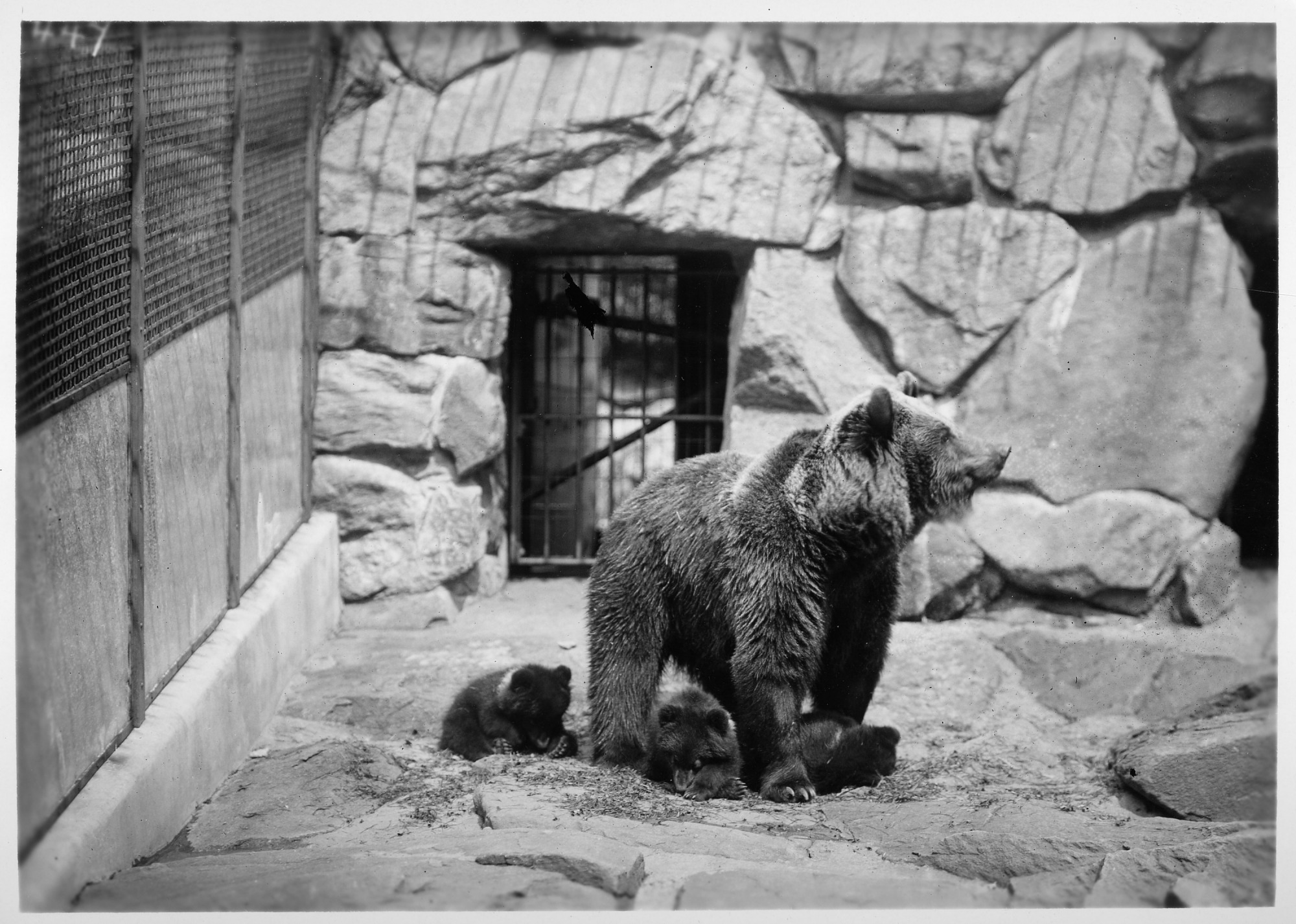 "Molly," a European Brown Bear, with her three cubs who were born at the National Zoological Park. The photo was taken in the original bear yards which were quarried out of some exposed rock at the eastern edge of the Park.