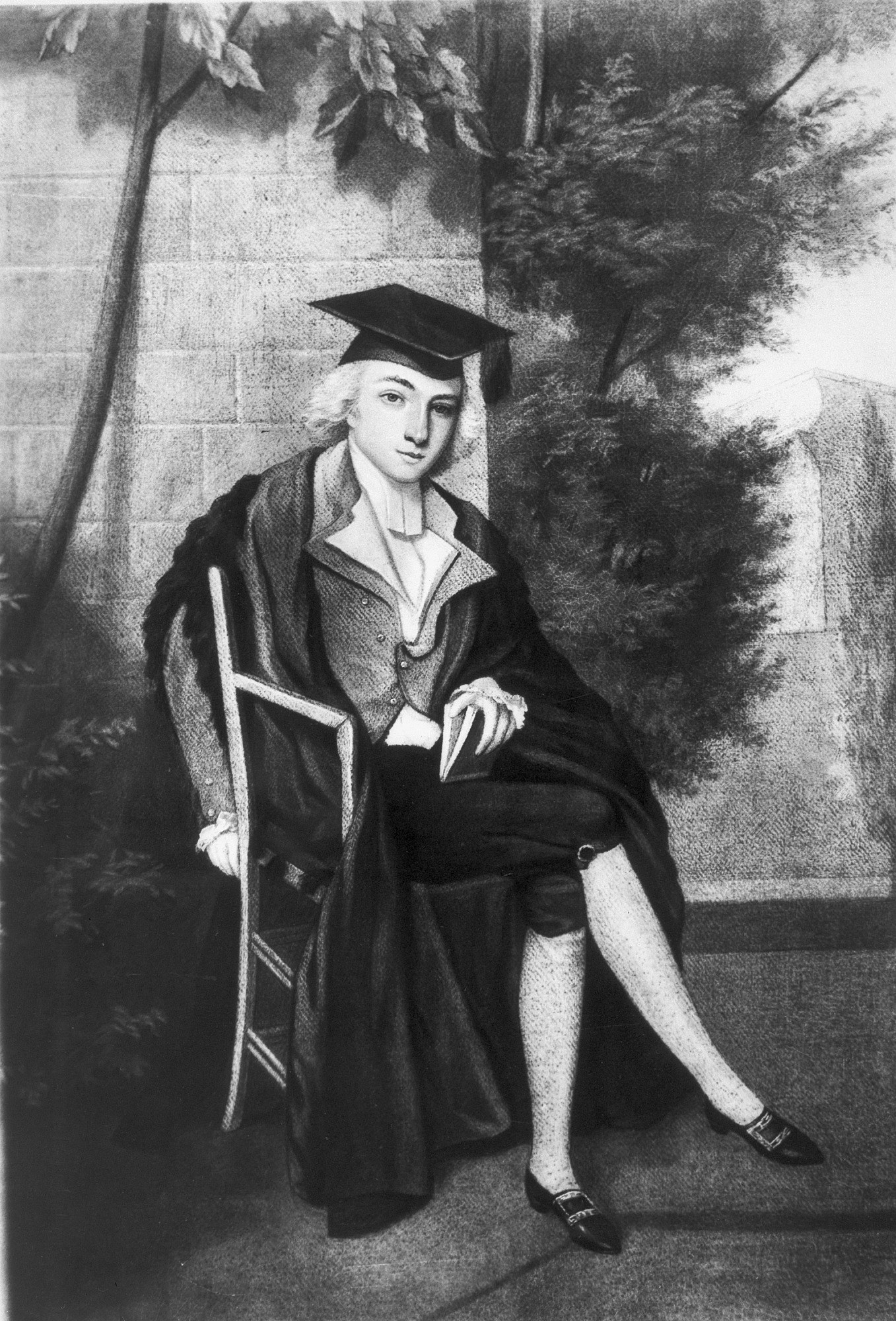 Photograph of an oil on canvas portrait of James Smithson in cap and gown, while a student at Pembroke College, Oxford, painted by James Roberts (1753 -c.1809) in 1786. Smithson attend Pembroke College, Oxford, 1782-1786. Painting was purchased in 1850 from the widow of John Fitall, Smithson's former servant to whom he had granted an annuity. The original painting is located in the National Portrait Gallery.
