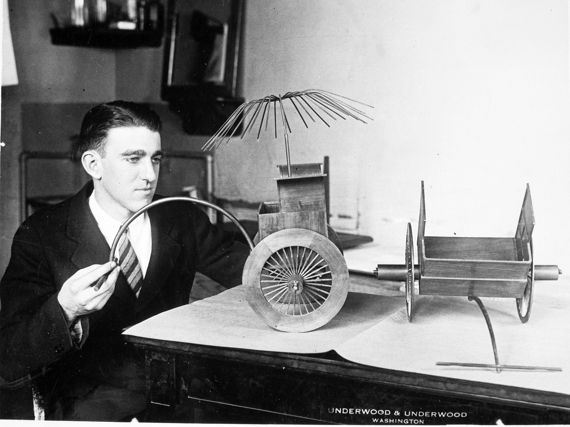 Frank A. Taylor examining two models of ancient Chinese war chariots, made in Peking, China from fragments which were dated to about 500 B.C. Taylor began his career in 1922 as a Laboratory Apprentice in the Division of Mechanical Technology in the United States National Museum, now known as the Arts and Industries Building.