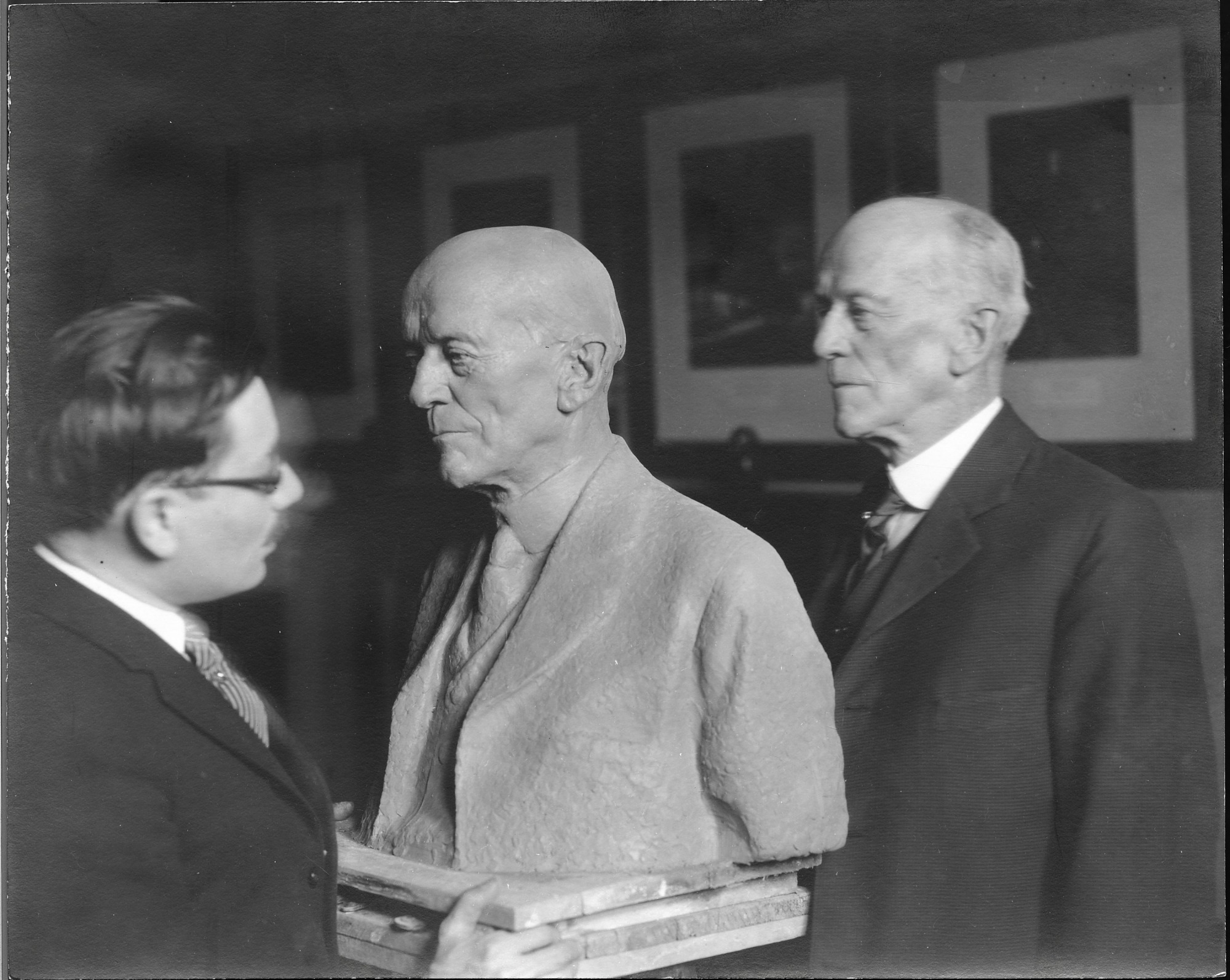 Charles D. Walcott, fourth Secretary of the Smithsonian Institution from 1907 to 1927, with sculpted bust of himself and the artist. The sculptor is not identified and there is no date on the photo, however, based on Walcott's appearance, this photograph was most likely in the mid-1920's.