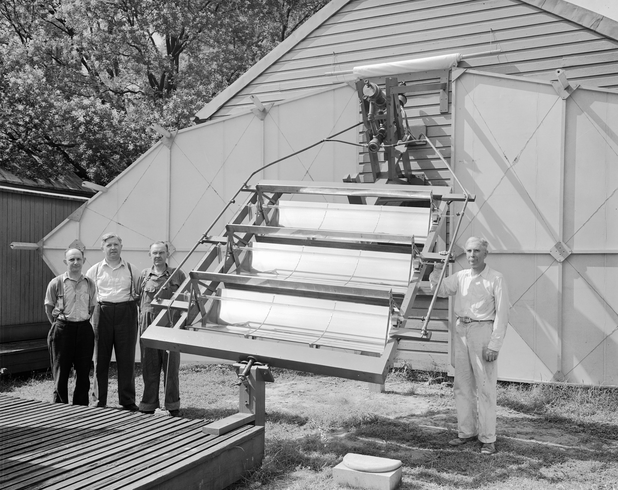 Astrophysicist and fifth Secretary of the Smithsonian Institution (1928-1944) Charles G. Abbot with a half horse-power solar boiler, exhibited at the International Congress of Engineers and used by the National Broadcasting Company with a steam engine and generator to broadcast to the United States and Canada. In the South Yard behind the Smithsonian Institution Building or "Castle", Secretary Abbot is seen here to the right of the photograph with his hand on the machine. There are three unidentified men to the left of the solar boiler.