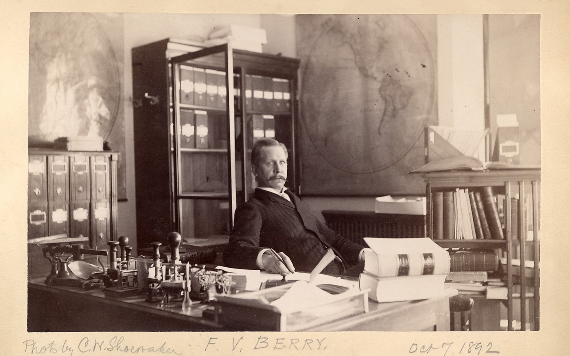 Ferdinand V. Berry, Chief Clerk of the Bureau of International Exchanges, later the International Exchange Service, working at his desk, 7 October 1892.