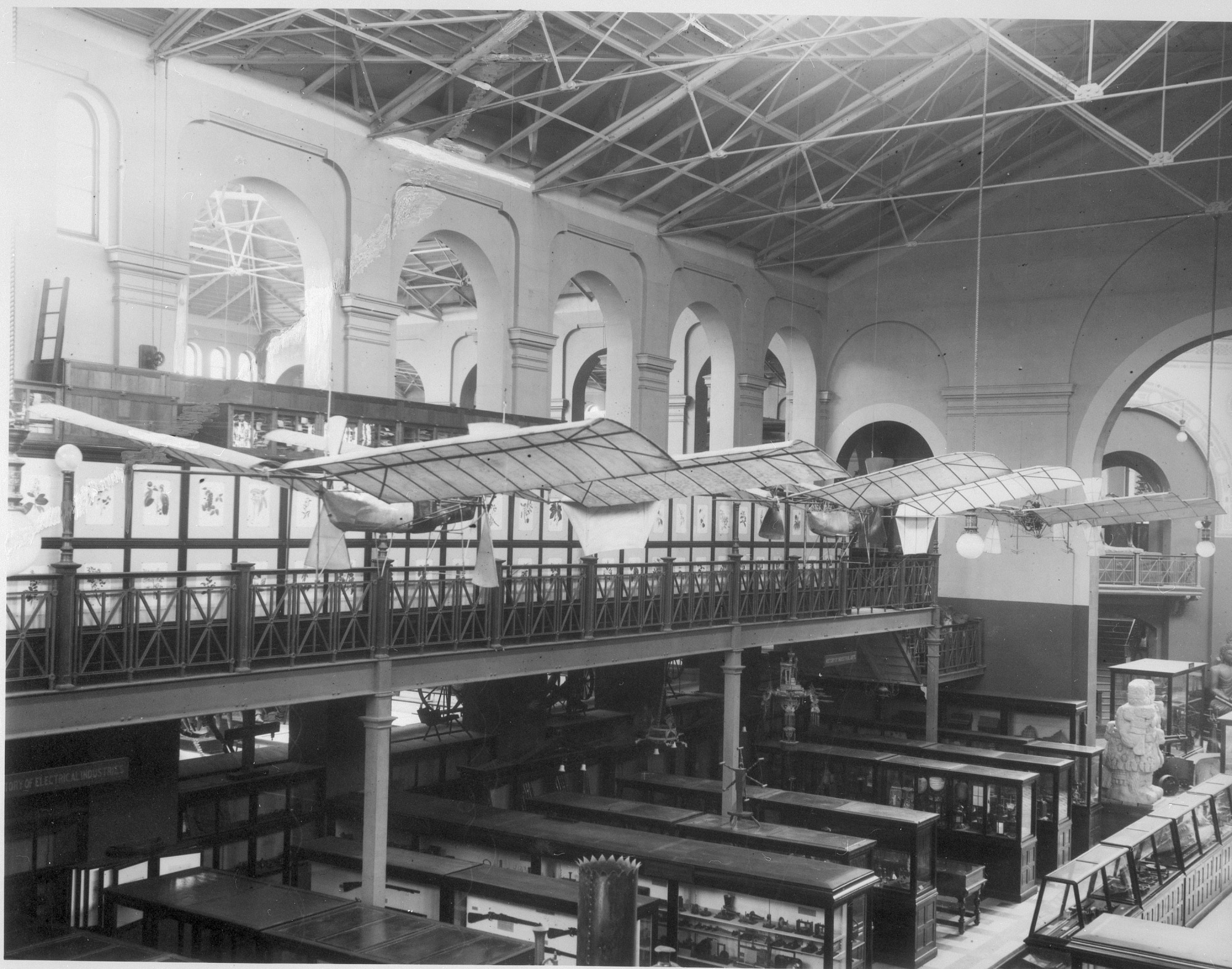 Looking west toward the Rotunda, suspended above the East Hall in the United States National Museum, now the Arts and Industries Building, are several of the aerodromes built by Secretary Langley in his attempt to create the first manned flight vehicle. An exhibit of botanical prints can be seen on the balcony; technology exhibits can be seen on the ground floor; and a small portion of the Ethnology exhibit can be seen in the Rotunda.