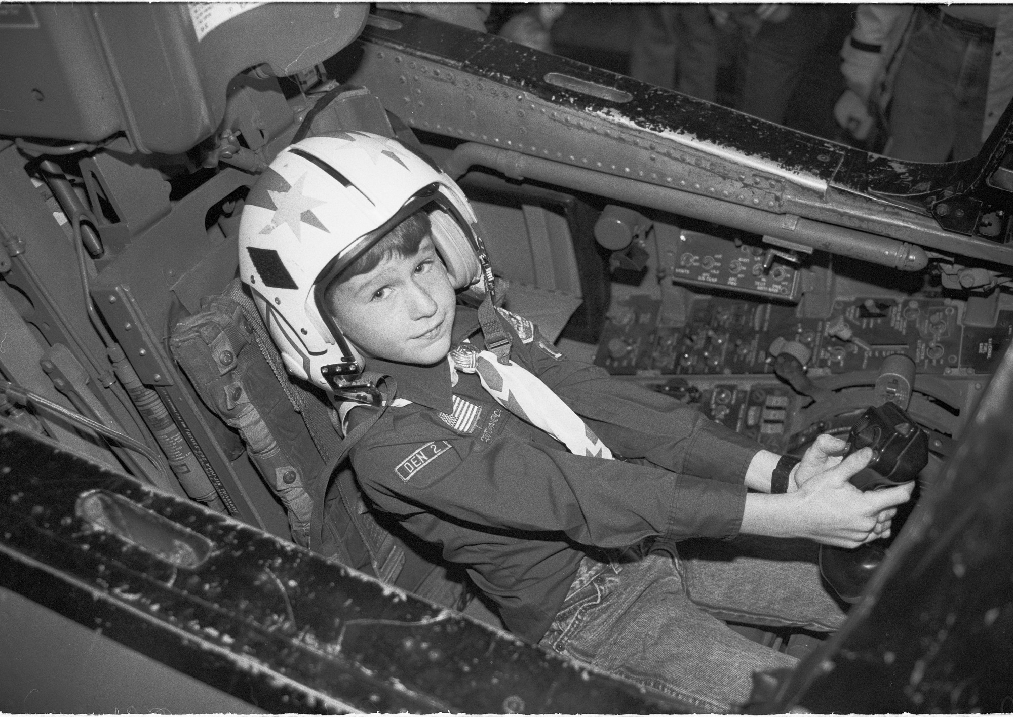 Publicity photo for "Wings & Things" open house at the Paul E. Garber Facility in Suitland, MD on April 29-30, 1989. Featured in the photo is a boy seated in the cockpit of a plane.