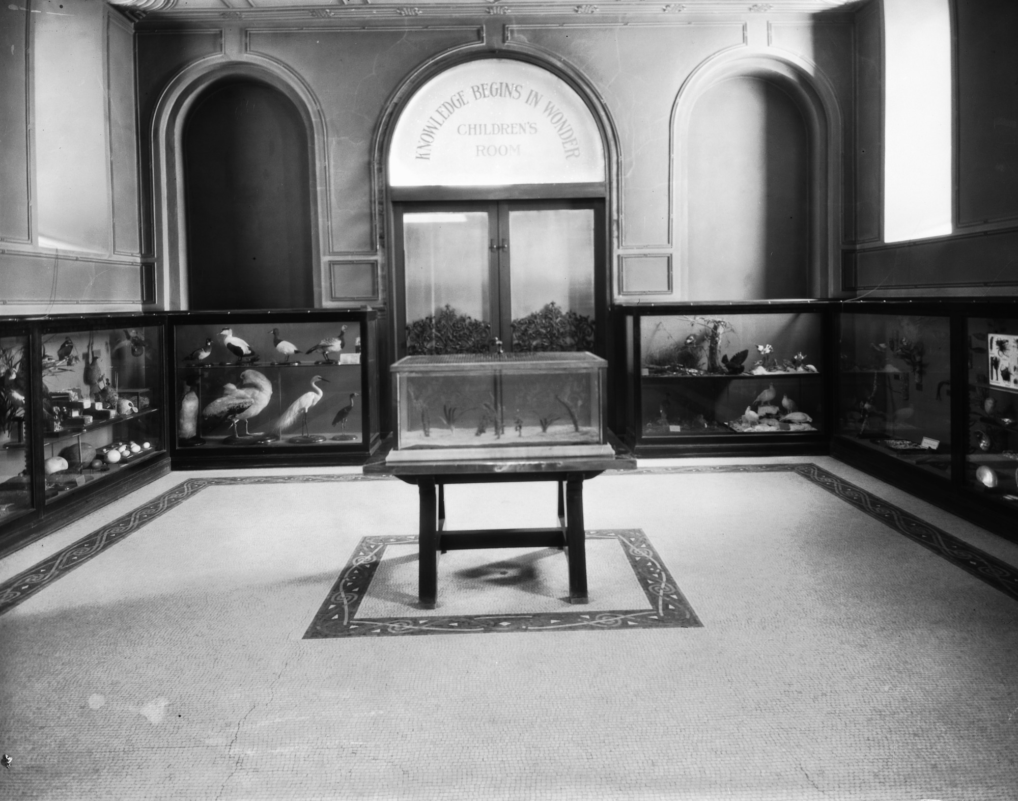 Children's Room in the South Tower of the Smithsonian Institution Building (SIB), or "Castle." The natural history displays were conceived by Secretary Samuel P. Langley (1887-1906) and were intended to inspire children to study the natural world. Cases were specifically designed to suit a child's height and all Latin labels were replaced with poetic inscriptions. Stenciled over the door to the garden was a quote paraphrased from Aristotle that reads, "Knowledge begins in wonder."
