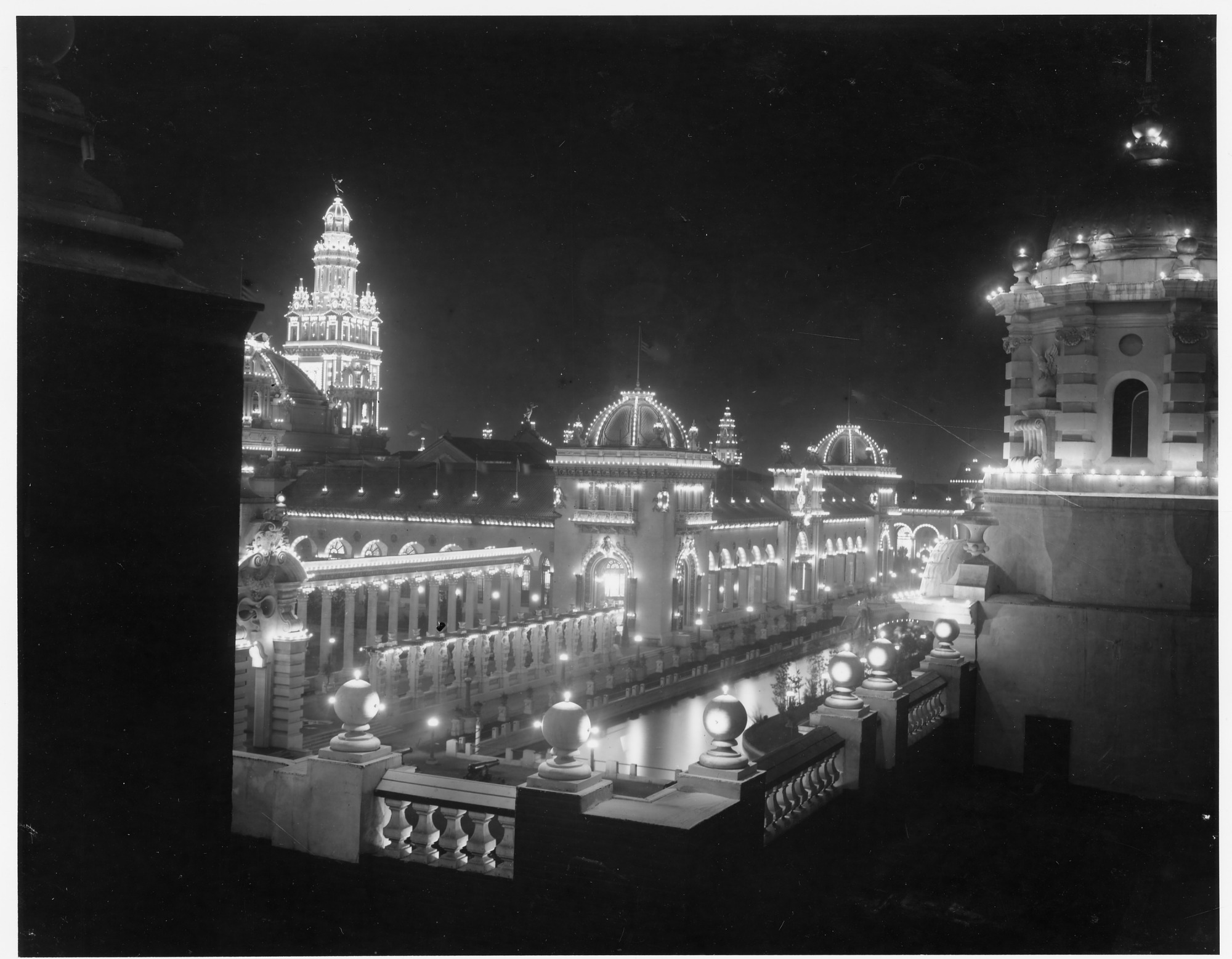 At the Pan-American Exposition, Buffalo, New York, a view of several of the buildings and structures lit up at night. The photograph was taken from a window or balcony of one of the buildings. The Smithsonian coordinated all of the U.S. Government exhibits and prepared a display on its activities and collections for the exposition.