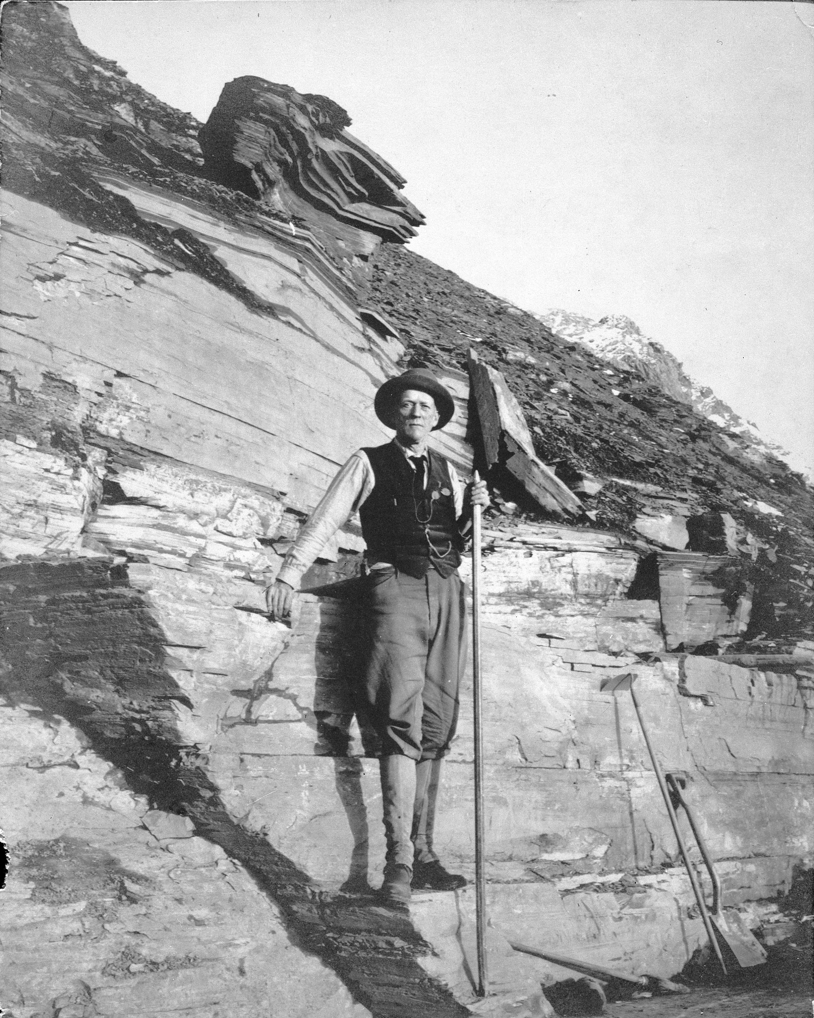 Charles D. Walcott (1850-1927), fourth Secretary of the Smithsonian Institution (1907-1927), in the field at Fossil Quarry, Burgess Pass, British Columbia, c. 1911-1912. Secretary Walcott is seen here standing against a rock wall holding a pry bar with several tools nearby, including a shovel, hoe, and axe.