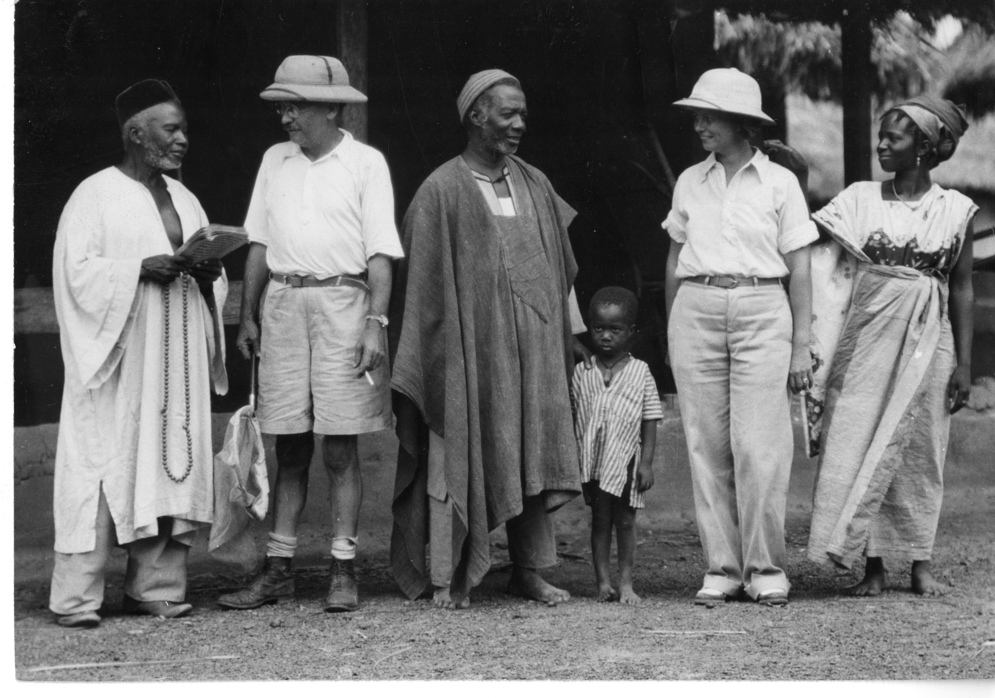 "At Bendaja, we made friends with Boima Quae (center), a famous old Gola chief, the Mohammedan priest of the village (far left), and Fermetah, the chief's favorite wife (far right)." William M. Mann, director of the National Zoological Park, is second from left; his wife, Lucile Quarry Mann is second from right. Manns were on the Smithsonian-Firestone Expedition to Liberia to collect animals for the National Zoological Park.