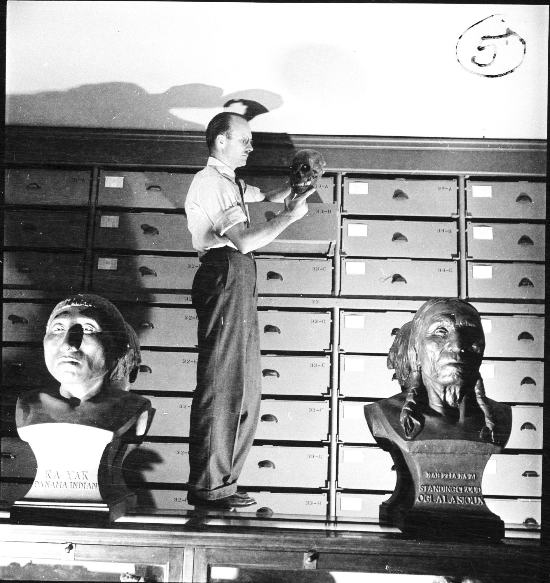 T. Dale Stewart, physical anthropologist, Department of Anthropology, United States National Museum (now the National Museum of Natural History), stands on a ladder examining a skull in the collection area. Photograph was probably taken on October 3, 1950 by the Federal Bureau of Investigation. Stewart often examined skeletons for the FBI and pioneered in the field of forensic anthropology.