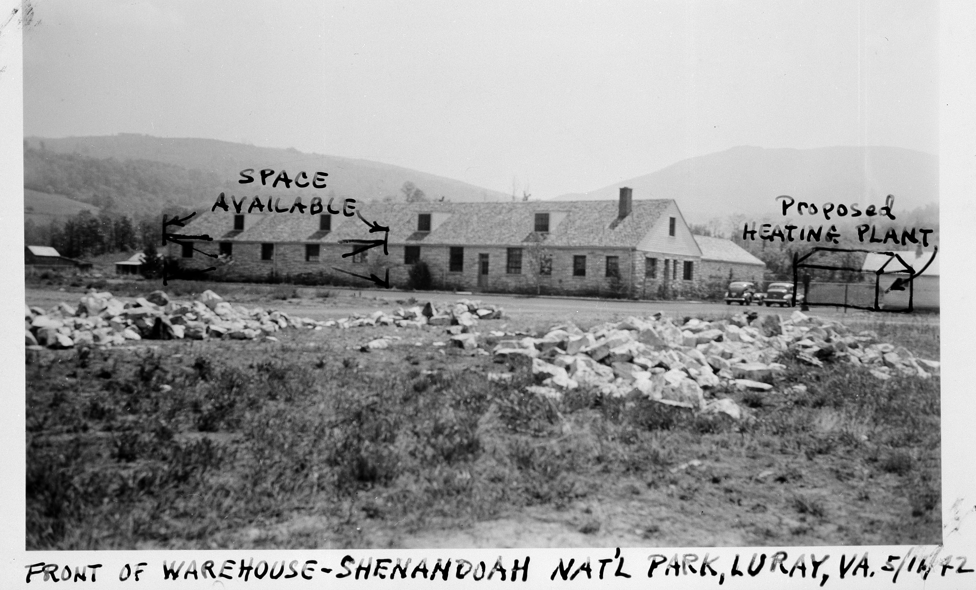 The front of the warehouse building in Luray, Virginia, near Shenandoah National Park, where United States National Museum collections were transferred for safekeeping during World War II. The photograph includes handwritten notes on where space was available in the warehouse, and a pen drawing of the proposed heating plant.