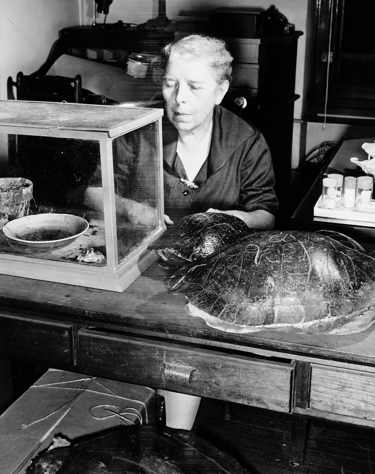 Doris Mable Cochran (1898-1968) herpetologist in the Division of Reptiles and Amphibians of the United States National Museum (now the National Museum of Natural History) working with collections, September 1954. There are turtle shells and a glass case with a frog in it on the table she is sitting at. Cochran was appointed an aide to Leonhard Stejneger in 1919, Assistant Curator in 1927, Associate Curator in 1942, and Curator in 1956. She retired in 1968.