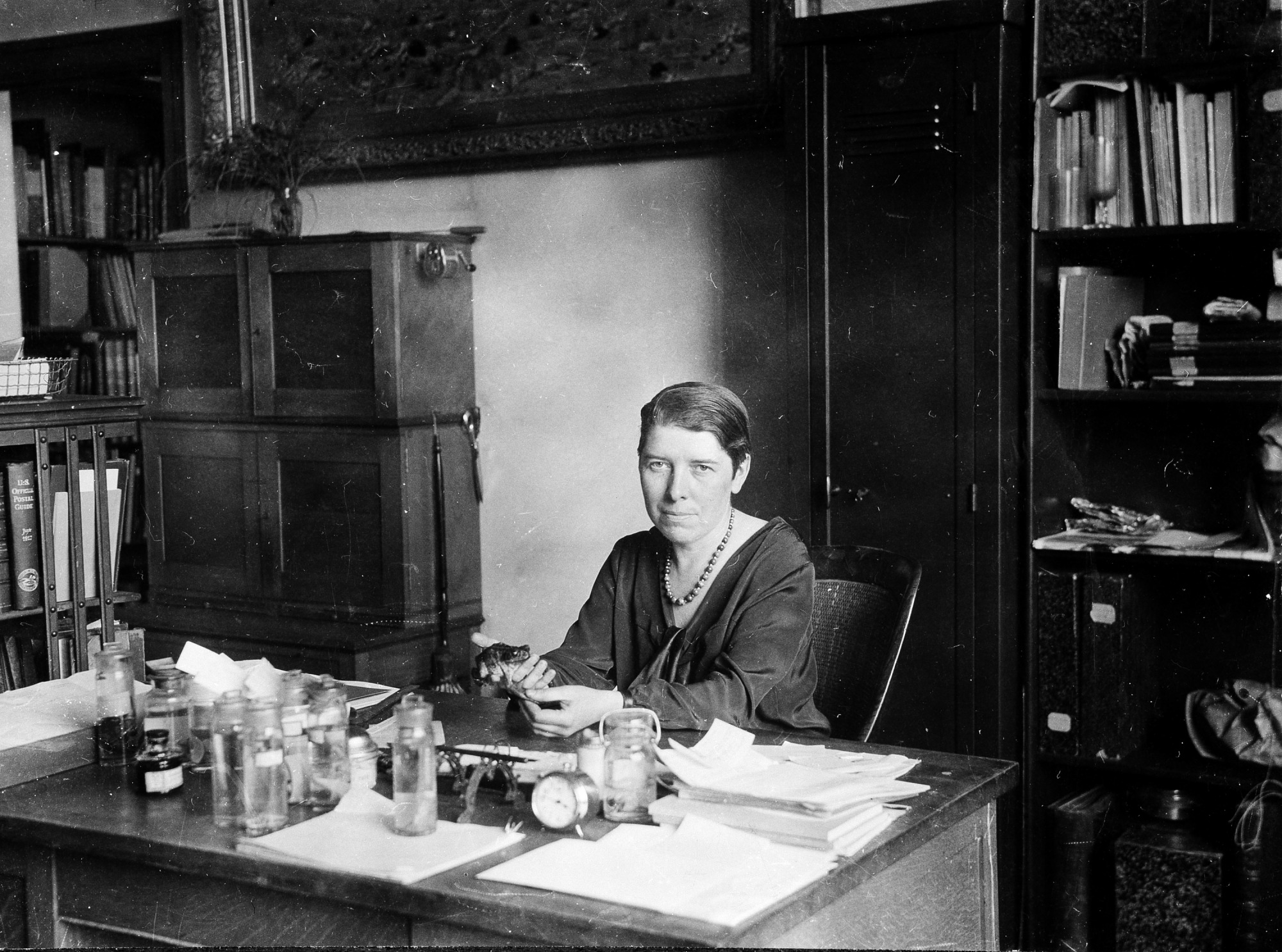 Doris Mable Cochran (1898-1968) herpetologist in the Division of Reptiles and Amphibians of the United States National Museum (now the National Museum of Natural History), at her desk holding a frog, and specimen jars are sitting on her desk, on April 13, 1934. She was appointed an aide to Leonhard Stejneger in 1919, Assistant Curator in 1927, Associate Curator in 1942, and Curator in 1956. She retired in 1968.