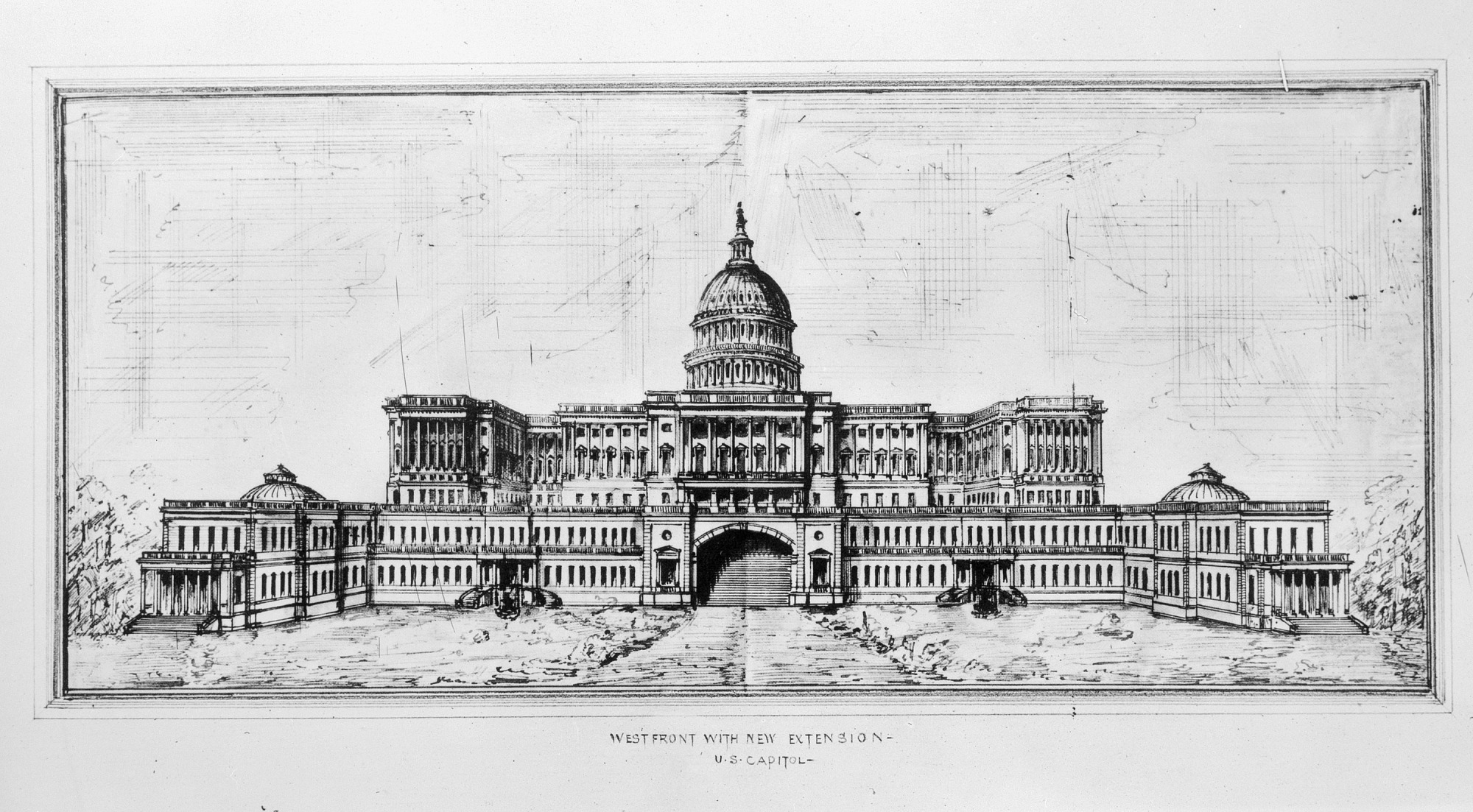 Engraving of west front of U.S Capitol with new extension.