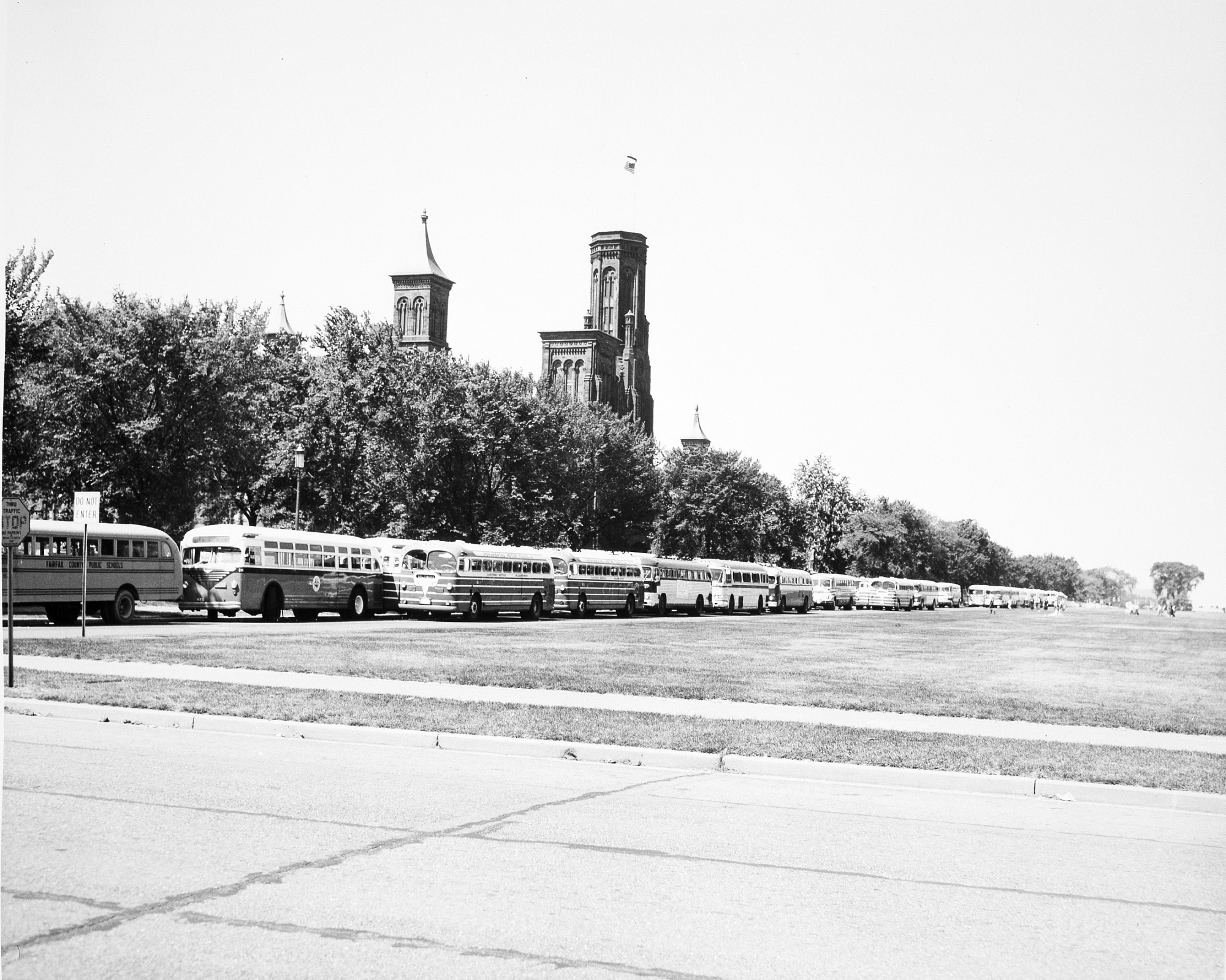 Buses Lined up on Mall with Smithsonian Instituion "The Castle" in Background