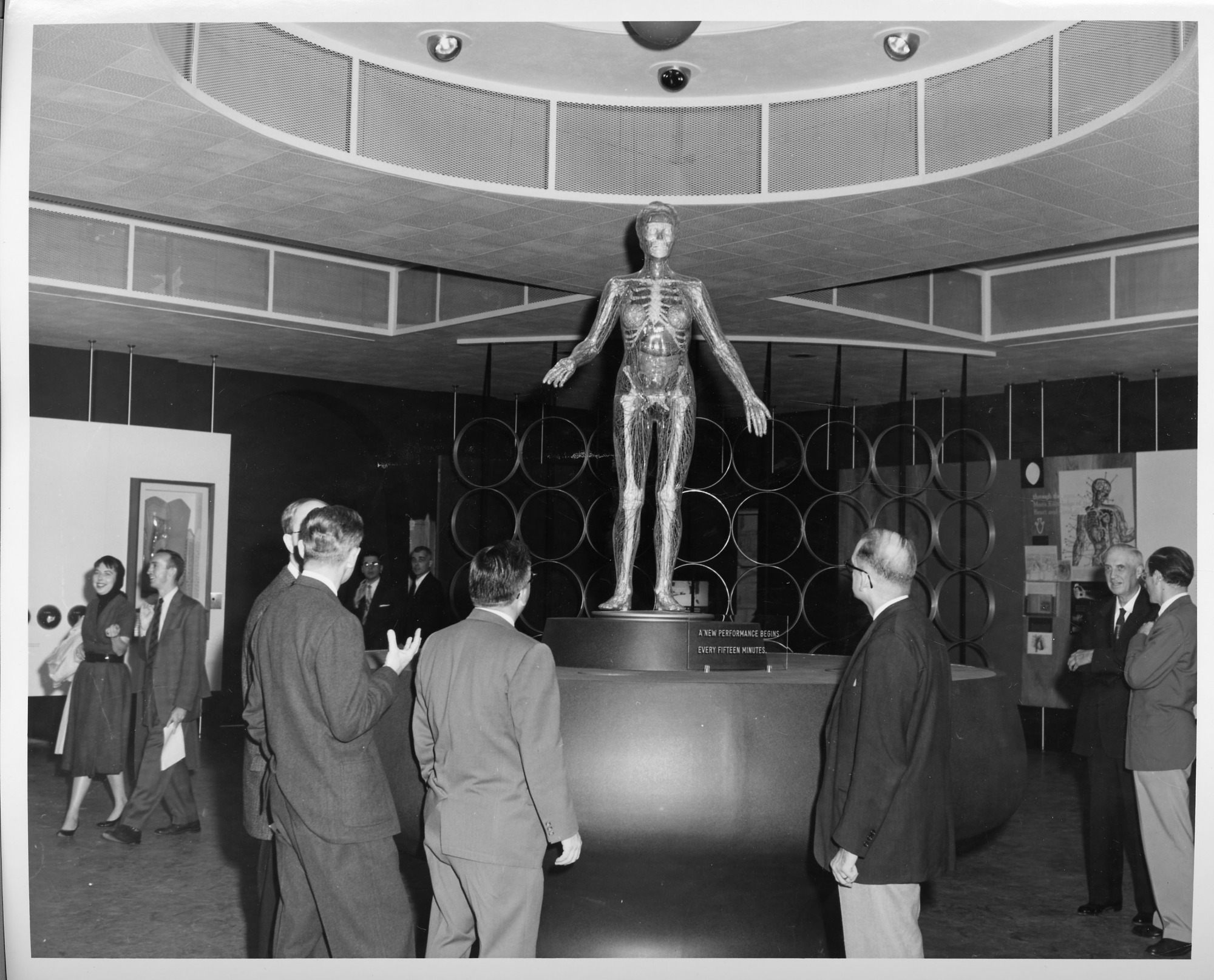Visitors viewing "Transparent Woman" at the opening of the Hall of Health. This display was part of the Exhibits Modernization Program and was located in the Arts and Industries Building. Assistant Secretary A. Remington Kellogg is the second from the right. Using electronic, sound and light, the figure of a woman demonstrates the major organs and systems of the human body.