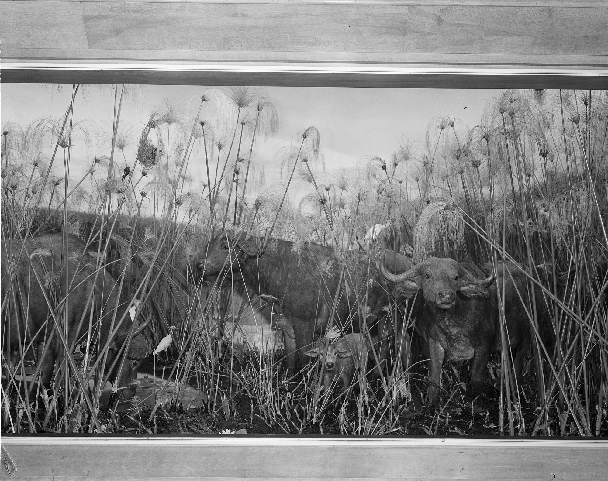 An exhibit case displays a Water-Buffalo in his natural habitat in the Hall of Mammals, National Museum of Natural History.