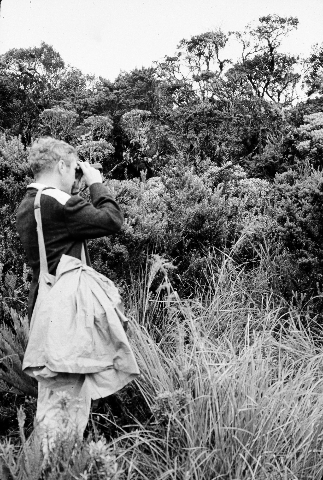 Martin H. Moynihan, conducting field work in the upper woods of Purace Park, Colombia, in June 10, 1969, appears to be using binoculars and has a big canvas bag over his shoulder. Moynihan was an ethologist and in 1957 became Resident Naturalist and Director (1959-1973) of a small field station on Barro Colorado Island, Panama, later named the Smithsonian Tropical Research Institute.