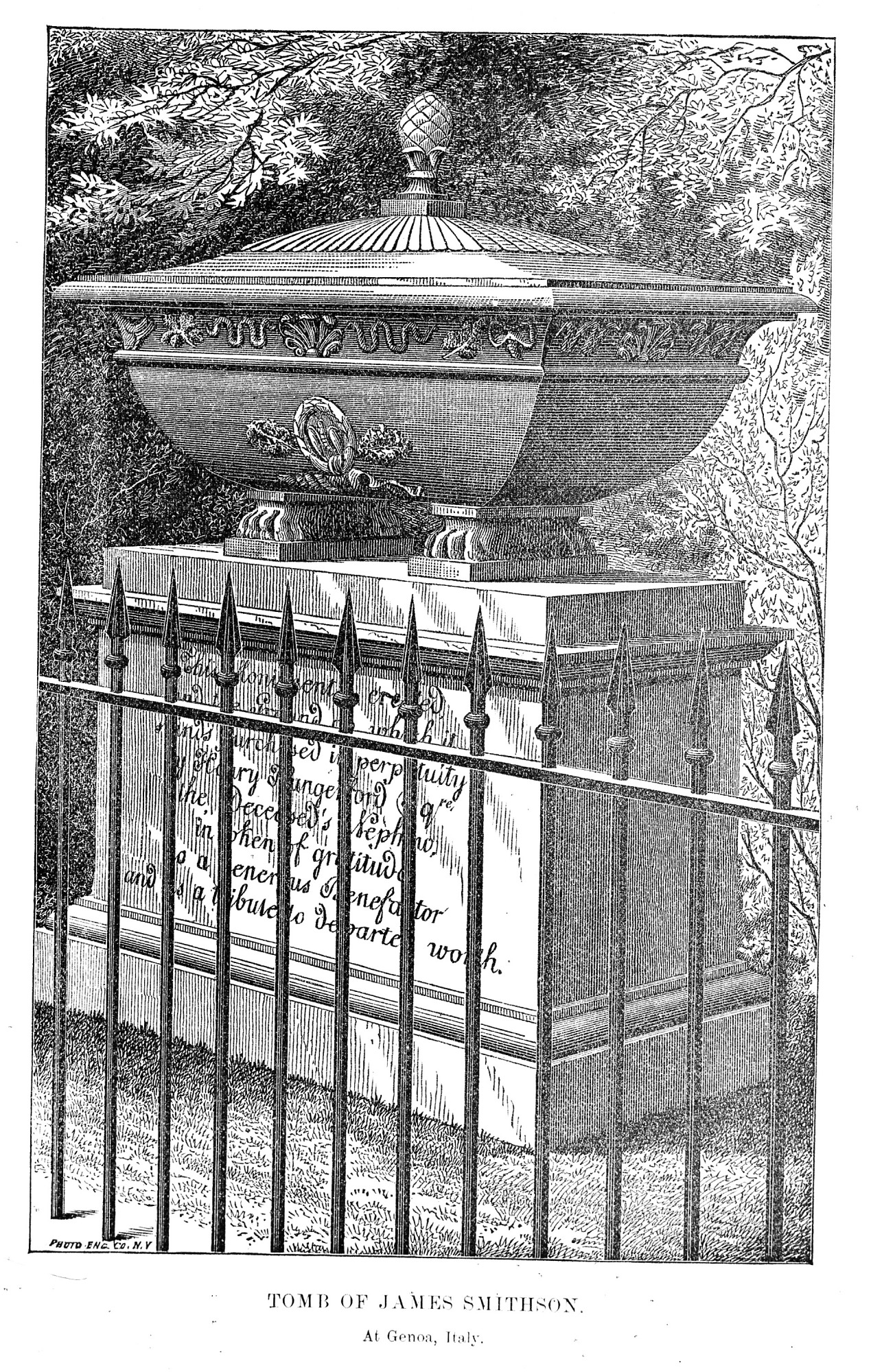 Engraving of James Smithson's grave in the Protestant or English cemetery on a hilltop near Genoa, Italy. The inscription reads: "This monument is erected, and the ground on which it stands purchased in perpetuity by Henry Hungerford, esq., the deceased's nephew, in token of gratitude to a generous benefactor and as a tribute to departed worth."