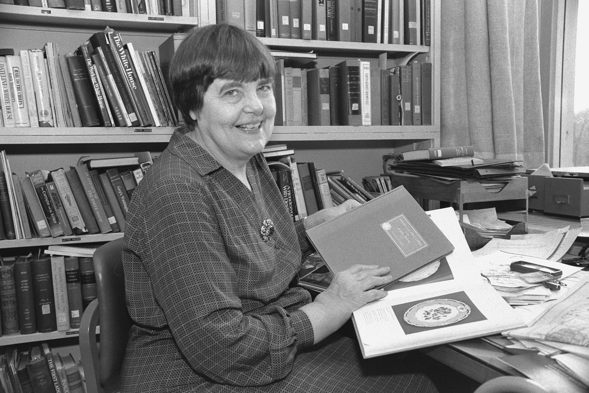Margaret Brown Klapthor, Curator, National Museum of American History's Division of Political History (1922 - 1994), responsible for the First Ladies' Gowns Collection, seated at her desk in her office, February 3, 1983.
