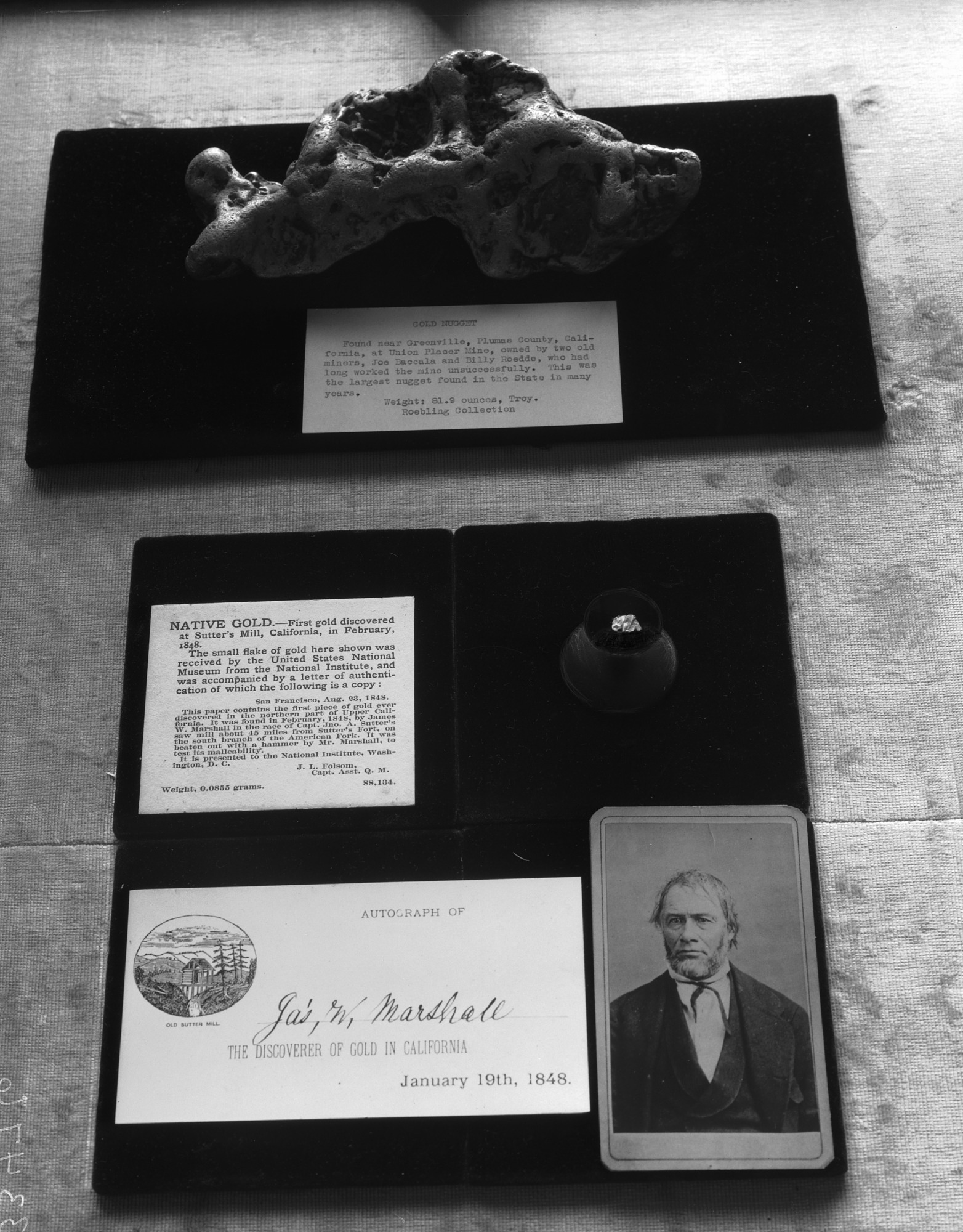 Exhibit in the Gems and Minerals Hall showing a flake of the first gold discovered at Sutter's Mill, California, February 1848, by James W. Marshall, photo of James W. Marshall, and a copy of the letter of authentication. Also, from the Roebling Collection, the largest gold nugget found in many years near Greenville, Plumas County, California, at Union Placer Mine, owned by two old miners, Joe Dacoala and Bill Roedde.