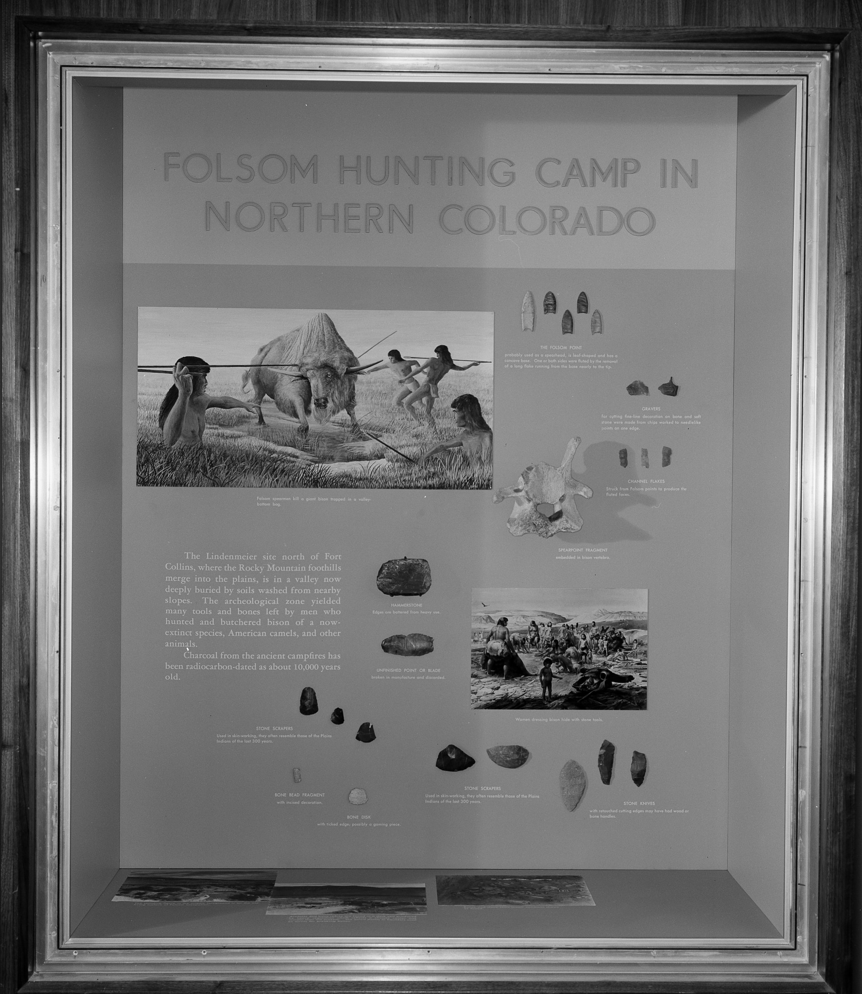 An exhibit case of the "Folsom Hunting Camp in Northern Colorado" contains tools and bones left by men who hunted and butchered bison of a now-extinct species, American camels and other animals. The exhibit is on display in the National Museum of Natural History's North American Archeology Exhibit which opened in November 1962.
