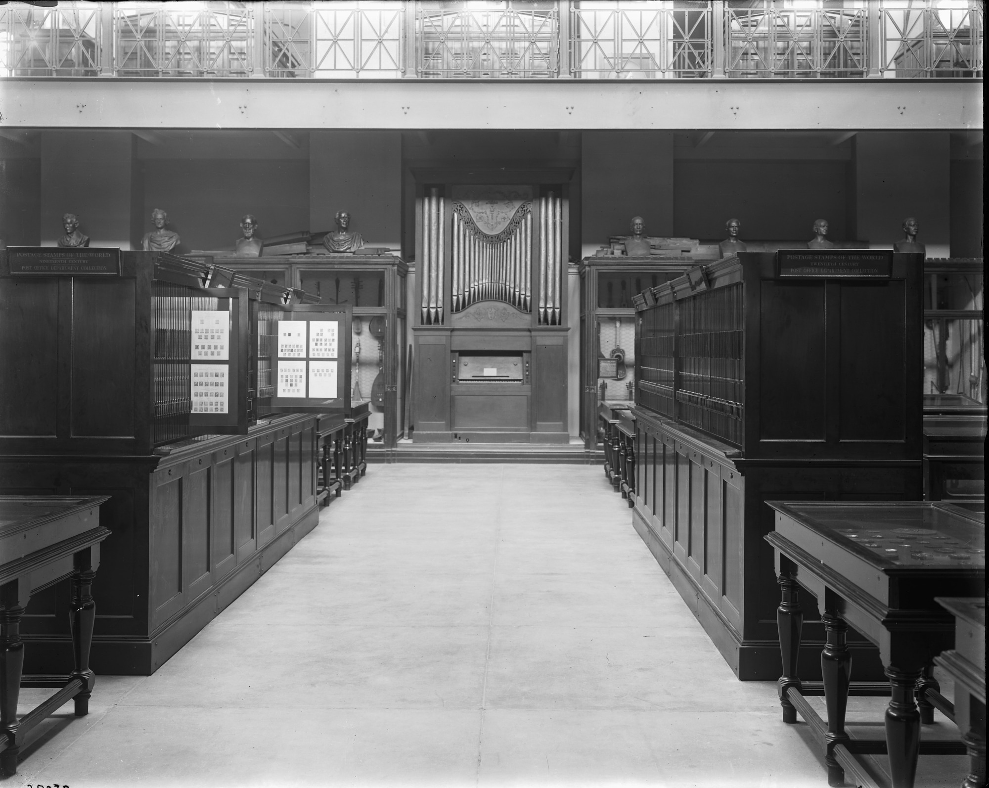 The Northwest Court of the United States National Museum, now the Arts and Industries Building, showing the Coins, Medals, Philatelic, and Musical Instruments Collections. Exhibits correspond to the floor plans from 1914 to 1925, but are gone by the c. 1930 Guidebook floor plan. A pipe organ can be seen in the rear and some of the stamp collections have been pulled out from the cases.