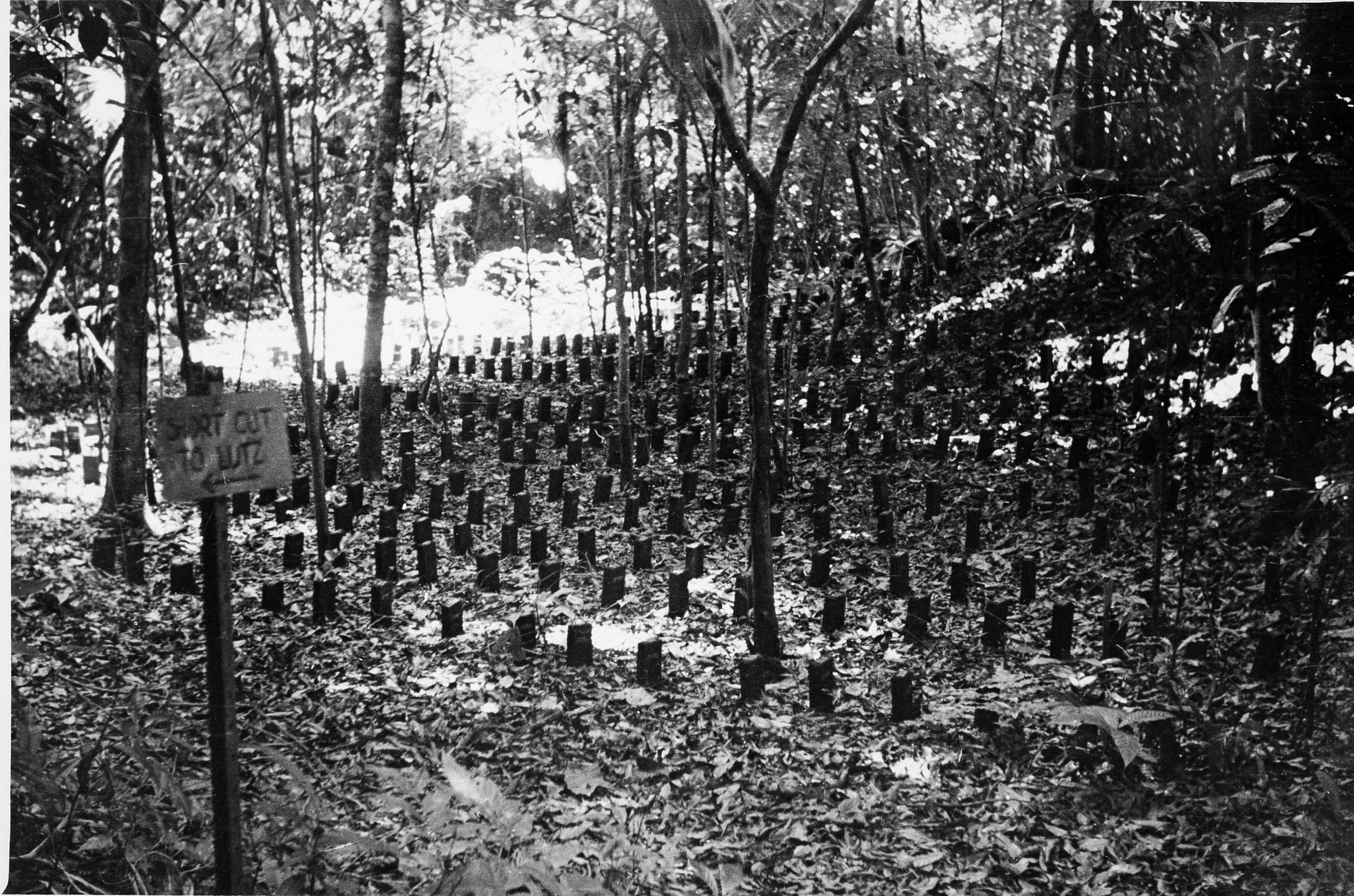 Wood test stakes for termite control on Barro Colorado Island in the Canal Zone Biological Area, on March 11, 1946. The field station was renamed the Smithsonian Tropical Research Institute in 1964.