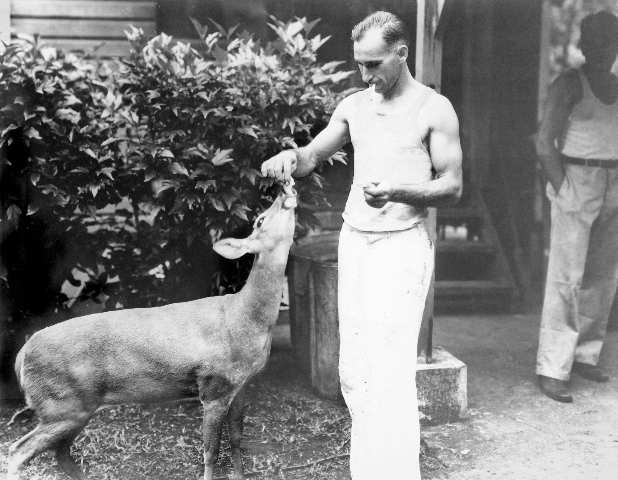 Francisco "Chi Chi" Vitola, chief of labor force for the Canal Zone Biological Area (CZBA), feeds a deer on Barro Colorado Island in the Panama Canal Zone. The CZBA was transferred to the Smithsonian in 1924 and in 1946 was renamed the Smithsonian Tropical Research Institute.