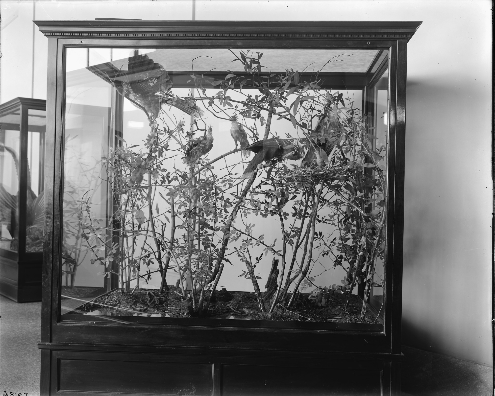 Exhibit cases display stuffed birds perched in a tree in the Bird Hall of the United States National Museum, now known as the National Museum of Natural History.