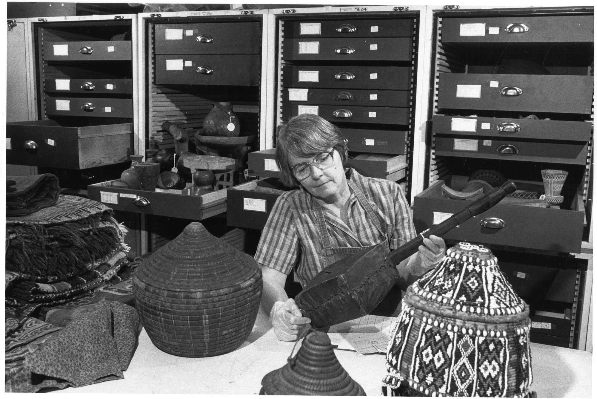 Alice Thomson with artifacts from Ethiopia and Somalia